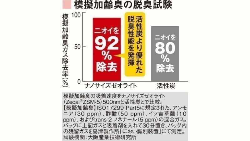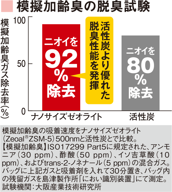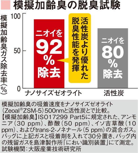 「模擬加齢臭」を用いた実験結果は、ナノサイズゼオライトの方が活性炭より加齢臭の除去が優れていました。以下の実験結果をご覧ください。