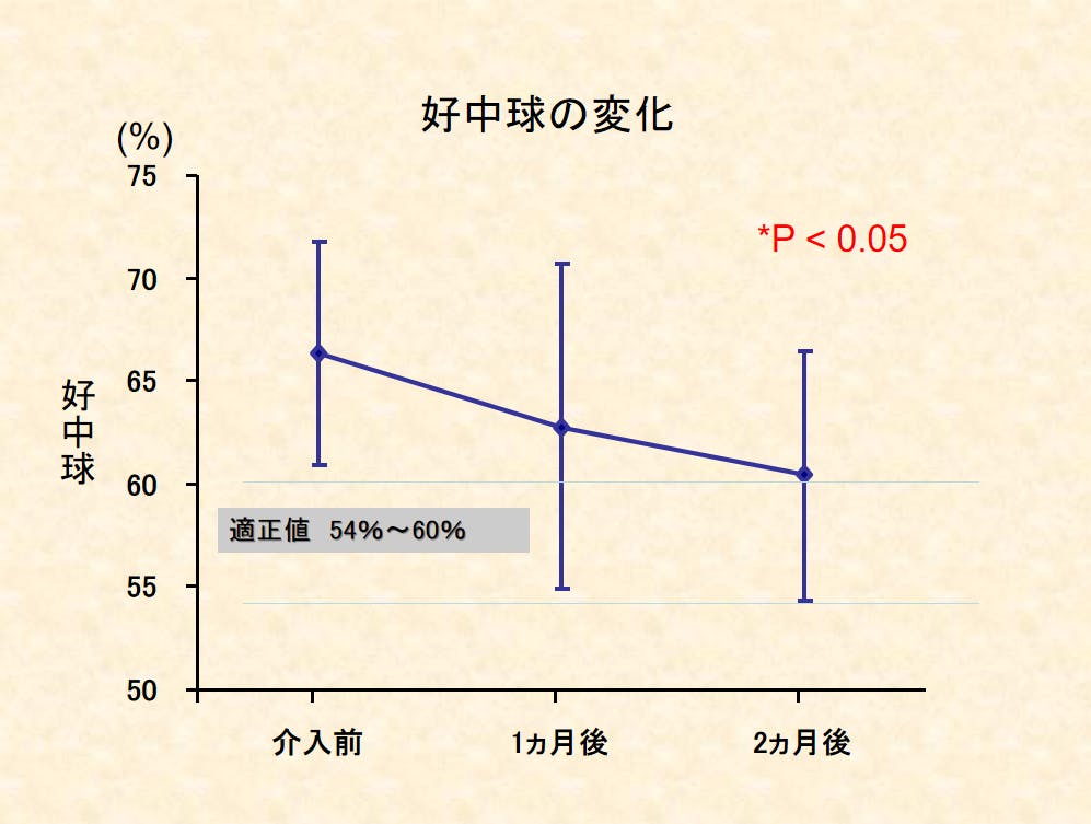 ストレス状態のときにはリンパ球が少なく、好中球が多いのですが、アルファビクスを行うことにより好中球が減り、リンパ球が増えるという結果も出ており、ストレス軽減の効果もあります!