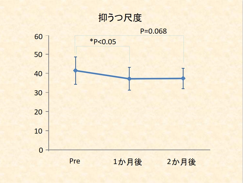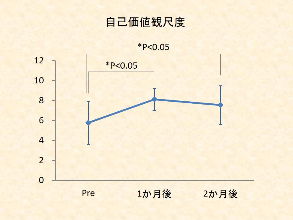 また、抑うつ尺度、自己価値観尺度、自己否定感尺度の心理テストの結果からも、アルファビクスが心理面にもよい働きをすることがわかりました。