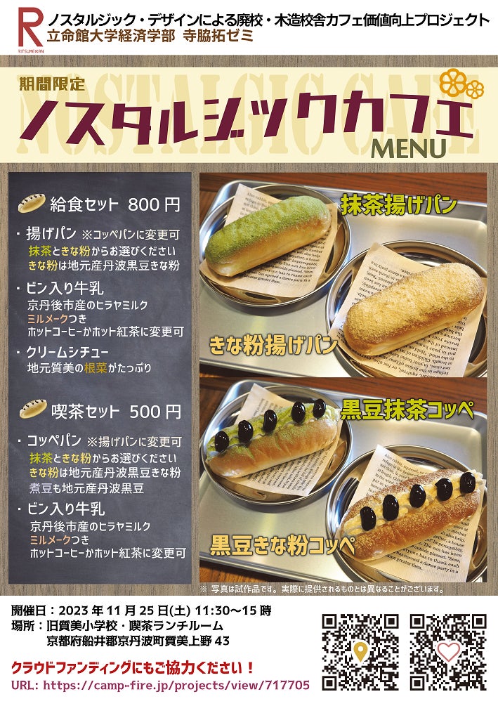 2023年11月18日(土)と25日(土)、私たちは京都府京丹波町にある旧質美小学校にて、地域の皆様のご協力を頂きながら「ノスタルジー」にフォーカスした廃校カフェを実験的に開きます!大学で学んだ知識を活かしてその価値を計測し、貴重な歴史文化資源である木造校舎の保存・継承に貢献します!