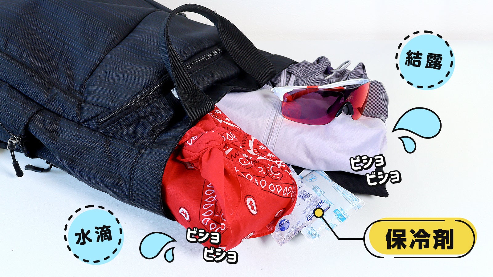 お弁当と一緒に入れた「保冷剤」やペットボトルの結露による水分で、リュックの中の着替えやタオルがビショビショに・・・
