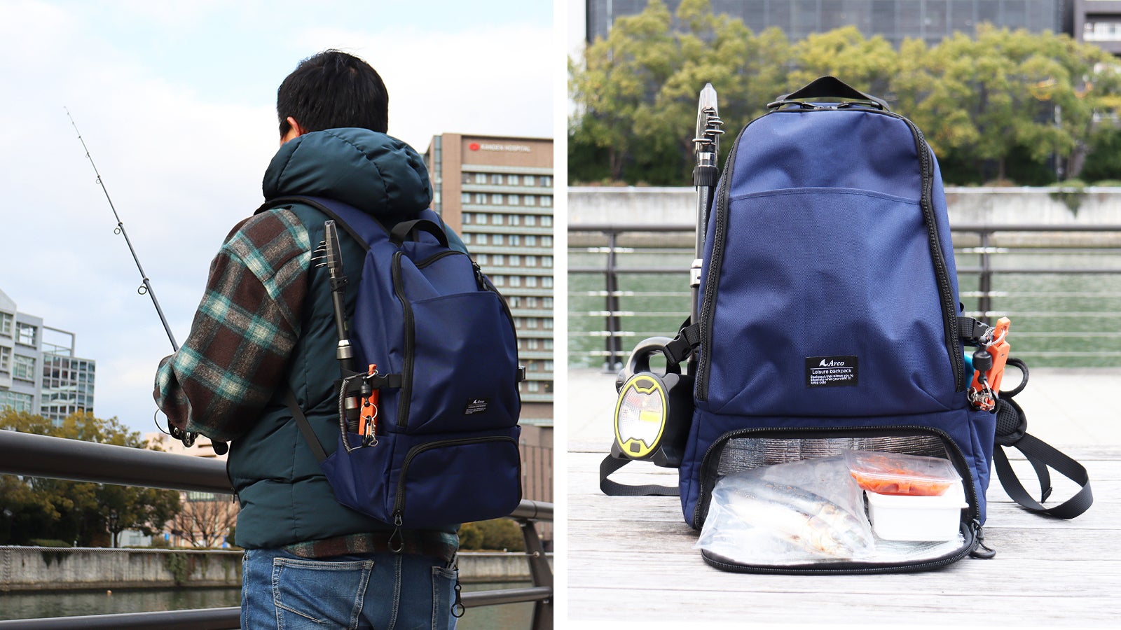 横のポケットに竿を挿して背負って行きます。保冷温効果があるので、下段にエサや、釣った魚を入れるのに重宝してます♫