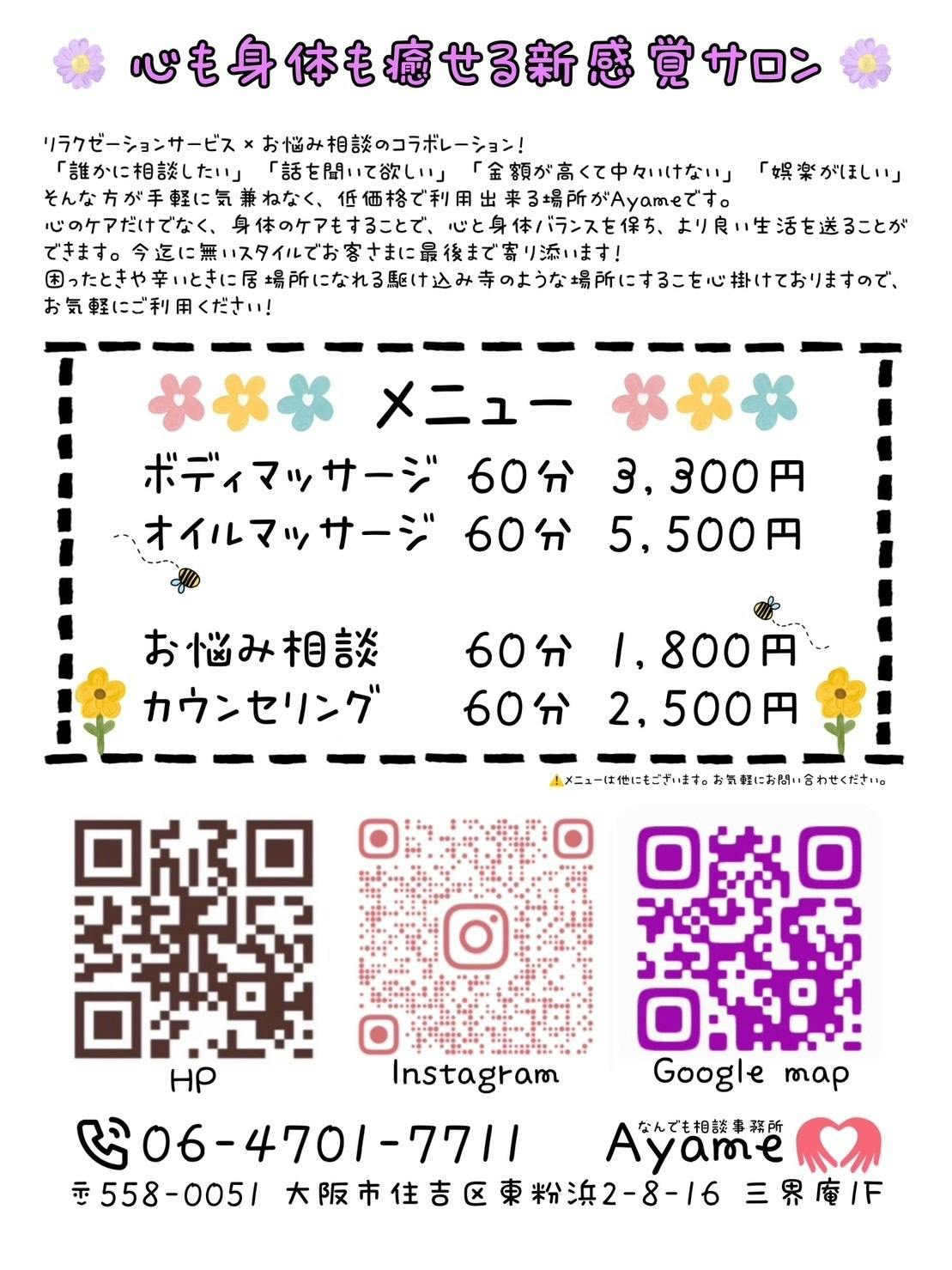 ※リラクゼーションマッサージorお悩み相談、どちらを選ばれた際も大阪市内の店舗で行います。( ⚠️ 住所はHPをご覧ください。 )
