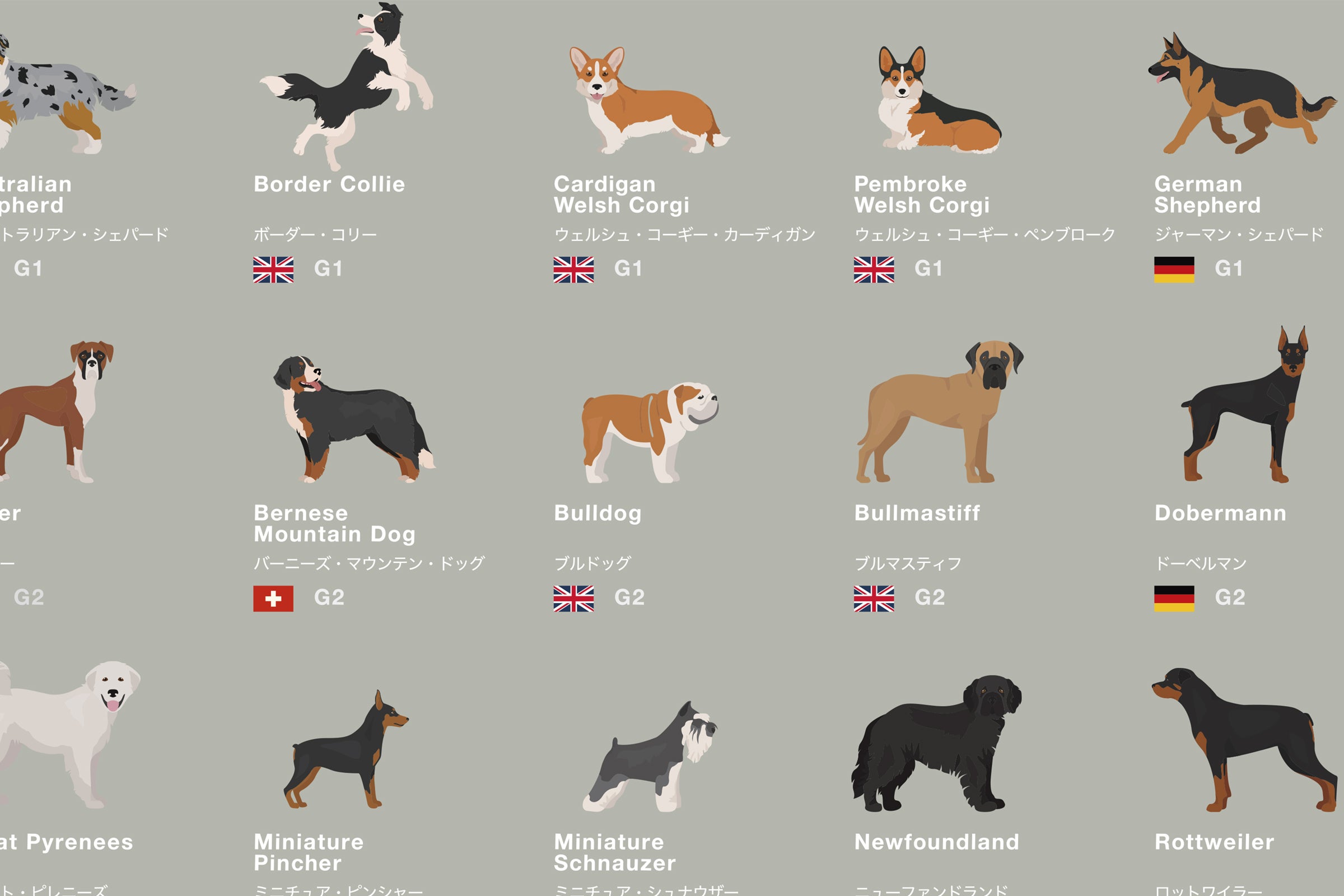 オーストラリアン・シェパード、ボーダー・コリー、ウェルシュ・コーギー・カーディガン、ウェルシュ・コーギー・ペンブローク、ジャーマン・シェパード、ラフ・コリー、シェトランド・シープドッグ、ボクサー、バーニーズ・マウンテン・ドッグ、ブルドッグ、ブルマスティフ、ドーベルマン、グレート・ピレニーズ、ミニチュア・ピンシャー、ミニチュア・シュナウザー、ニューファンドランド、ロットワイラー、セント・バーナード、エアデール・テリア、ブル・テリア、ジャック・ラッセル・テリア、スタッフォードシャー・ブルテリア、ウェスト・ハイランド・ホワイト・テリア、ワイアー・フォックス・テリア、ヨークシャー・テリア、ダックスフンド・スムースヘアード、秋田犬、アラスカン・マラミュート、チャウ・チャウ、日本スピッツ、ポメラニアン、柴犬、シベリアン・ハスキー、バセット・ハウンド、ビーグル、ブラッドハウンド、ダルメシアン、ブリタニー・スパニエル、イングリッシュ・ポインター、イングリッシュ・セター、アイリッシュ・セター、ワイナラマー、アメリカン・コッカー・スパニエル、イングリッシュ・コッカー・スパニエル、フラットコーテッド・レトリーバー、ゴールデン・レトリーバー、ラブラドール・レトリーバー、ボストン・テリア、キャバリア・キング・チャールズ・スパニエル、チワワ、フレンチ・ブルドッグ、マルチーズ、パピヨン、パグ、ペキニーズ、ミディアム・プードル、ミニチュア・プードル、トイ・プードル、シーズー、ボルゾイ、ウィペット