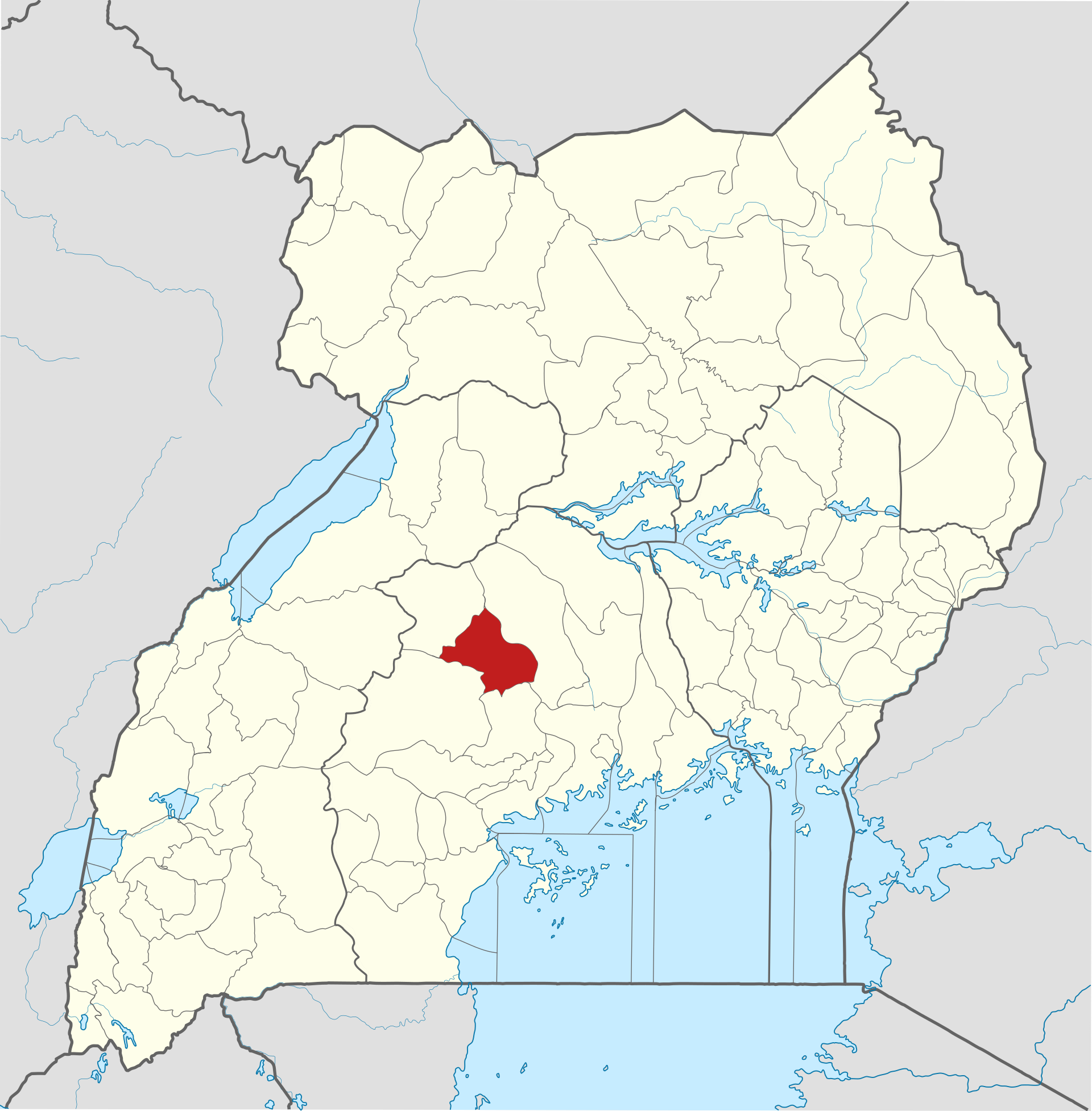 ウガンダ地図(赤く示された部分に野球場のあるガヤザ地区がある)