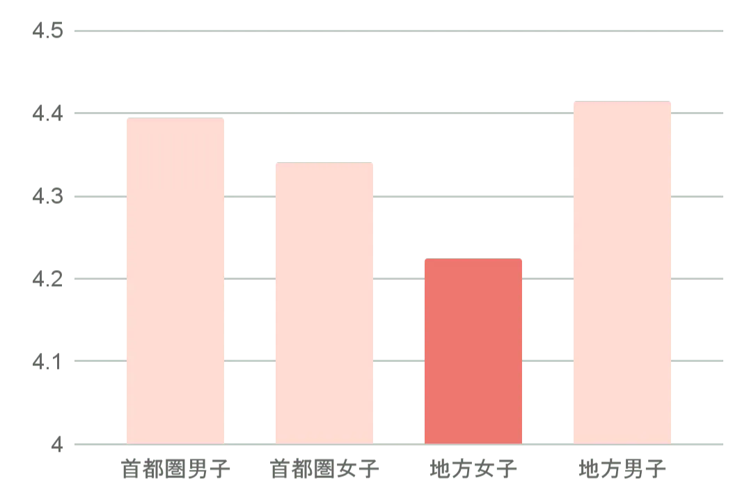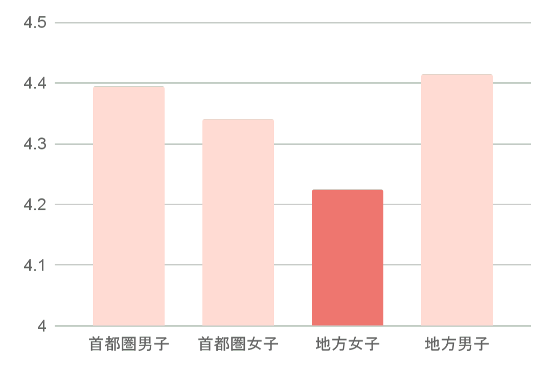同じ「客観的な学力」帯の人では、地方女子が首都圏女子・地方男子に比べ自己評価が低いことが分かりました。