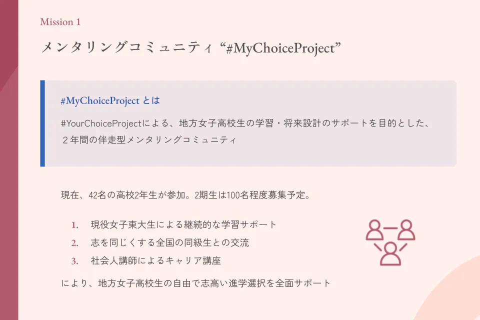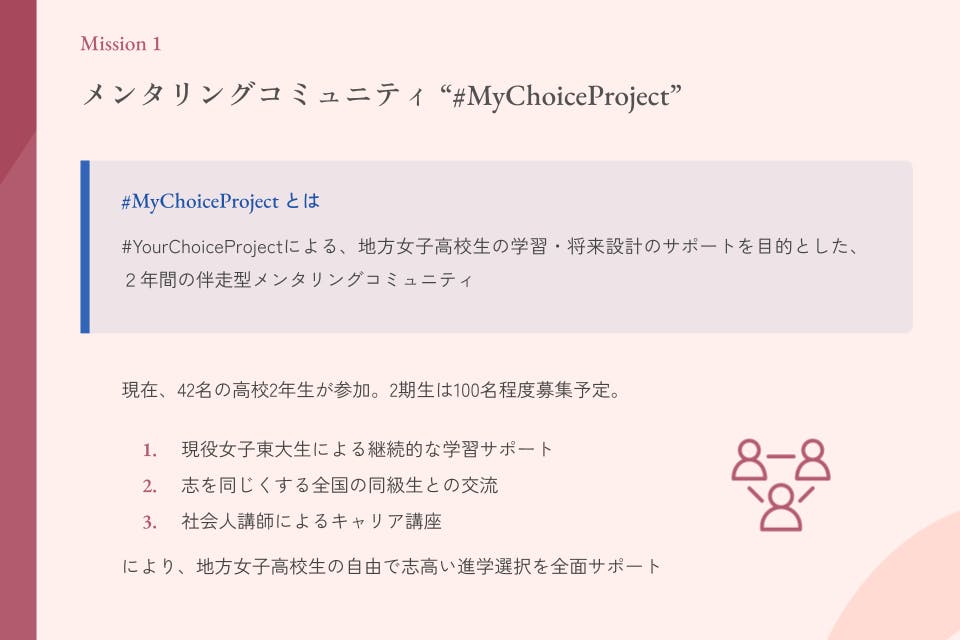 #YourChoiceProjectによる、地方女子高校生の学習・将来設計のサポートを目的とした、2年間の伴走型メンタリングコミュニティです。