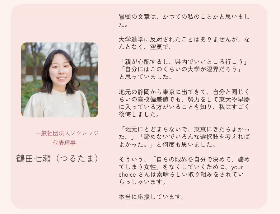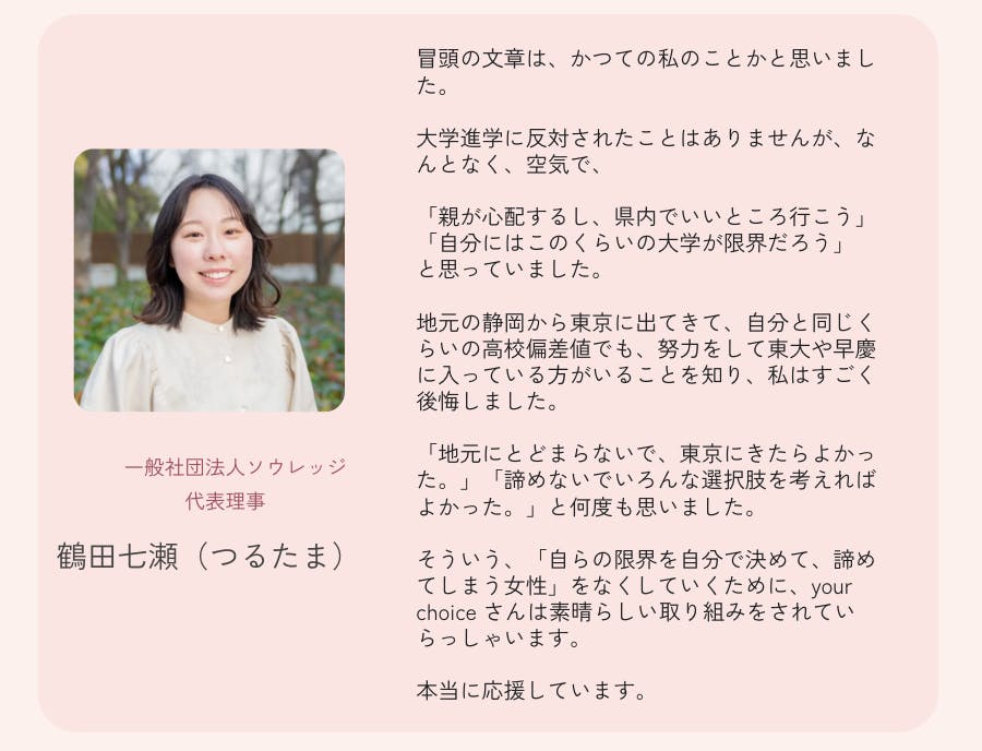 ぜひ、皆様に、地方女子学生の明るい明日をつくる仲間となっていただけると嬉しいです。