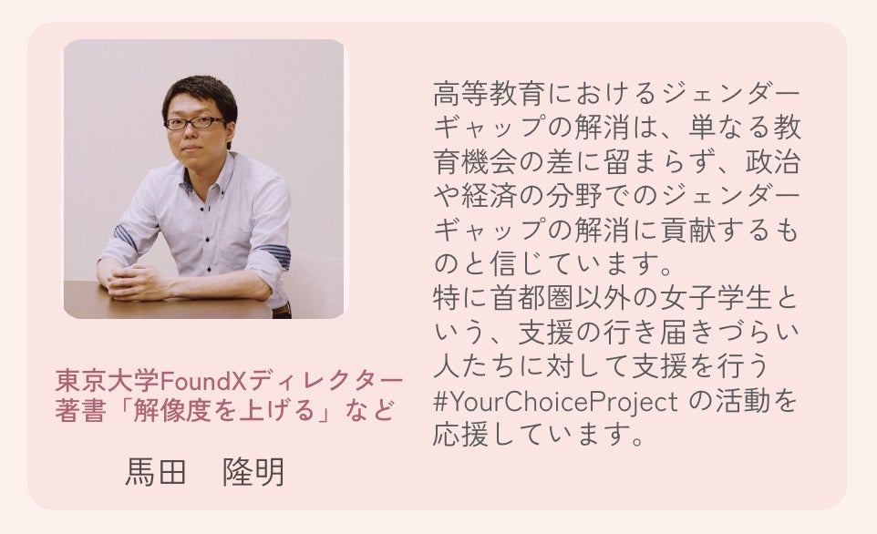 こんにちは、#YourChoiceProjectです。私たちは全ての学生が生まれついた地域やジェンダーに関わらず自由な進学・キャリア選択ができる社会を目指して、地方の女子高生の抱える進路選択上のジェンダーギャップの解消に努めています。
