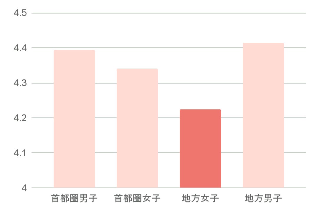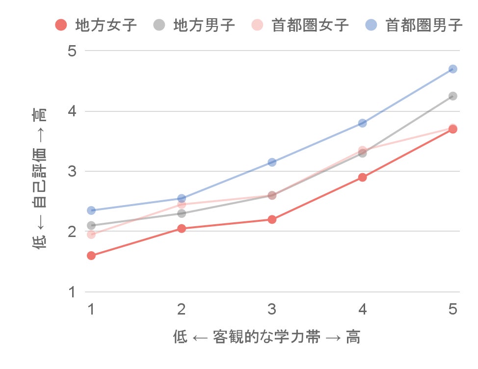 同じ「客観的な学力」帯の人では、地方女子が首都圏女子・地方男子に比べ自己評価が低いことが分かりました。