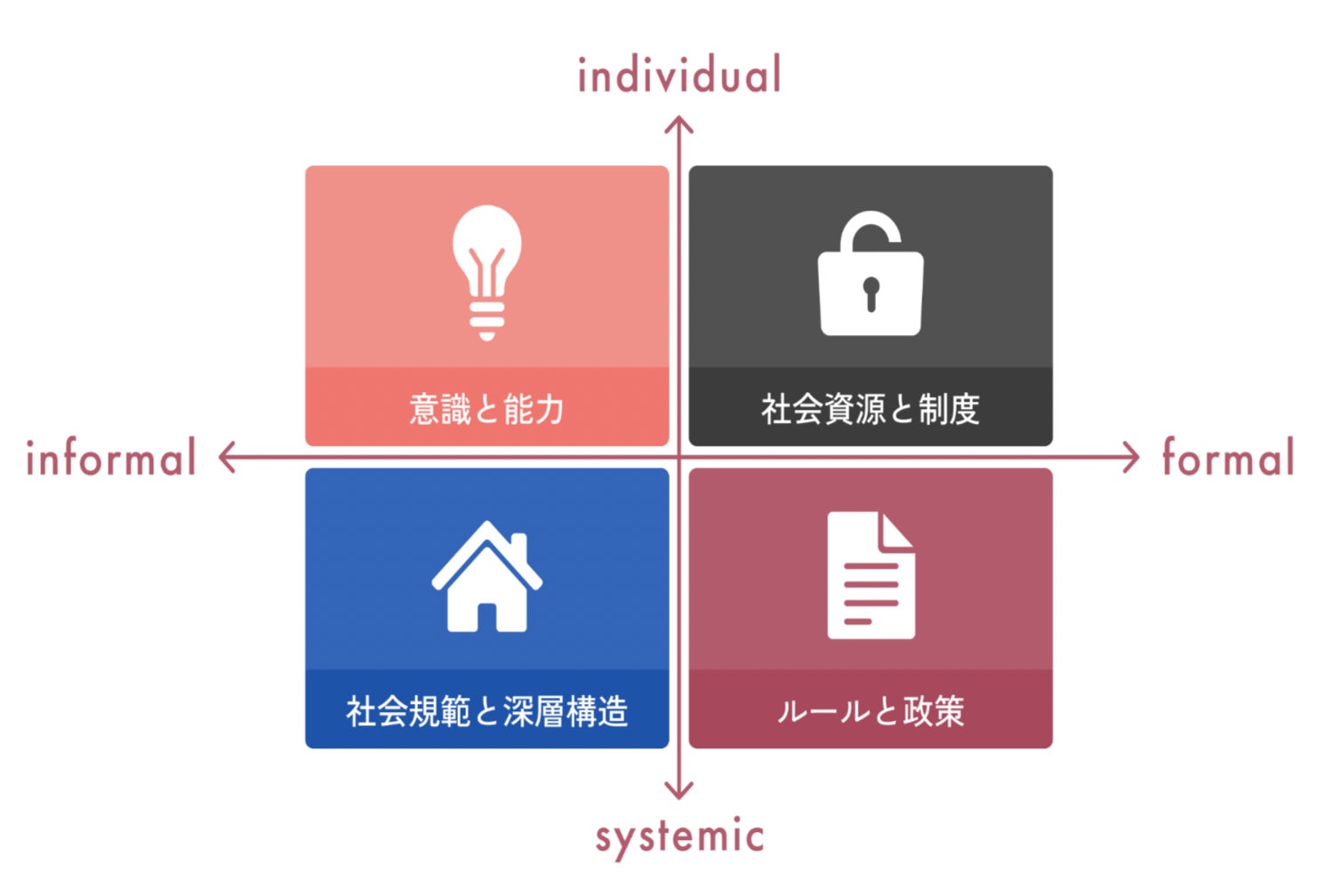 私たちは地方女子が抱える諸課題の抜本的解決に向けて、以下の4つの観点に包括的に取り組み、社会変革へのアプローチを目指します。そのために、Missionを大きく2つに設定し、さまざまな活動を行なっています。