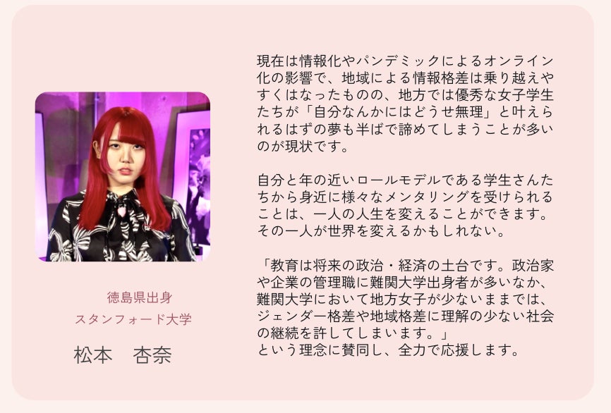 ぜひ、皆様に、地方女子学生の明るい明日をつくる仲間となっていただけると嬉しいです。