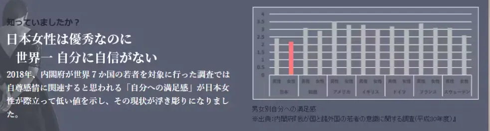 2018年、内閣府が世界7ヵ国の若者を対象に行った調査では自尊感情に関連すると思われる「自分への満足感」が日本女性が際立って低い値を示し、その現状が浮き彫りになりました。
