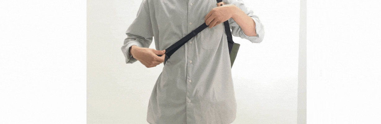 ファッション性と使い易さから、普段からトートバッグを愛用していましたが、この転倒を経験して以来、自転車に乗りながらの使用に恐怖を感じ、控えるようになりました。かといって、中身を取り出すのに着脱が必要なリュックや、本や書類があまり入らないメッセンジャーバッグやワンショルダーは、自分としてはイマイチ。「身体に固定できるトートバッグ」があれば、と考えるようになったのは、その頃からでした。そして、トートバッグのデザインはそのままで、ストラップによって簡単に身体に固定ができ、安全に自転車に乗る事もできて、両手も自由になる「固定式トートバッグ」を思いつきました。
