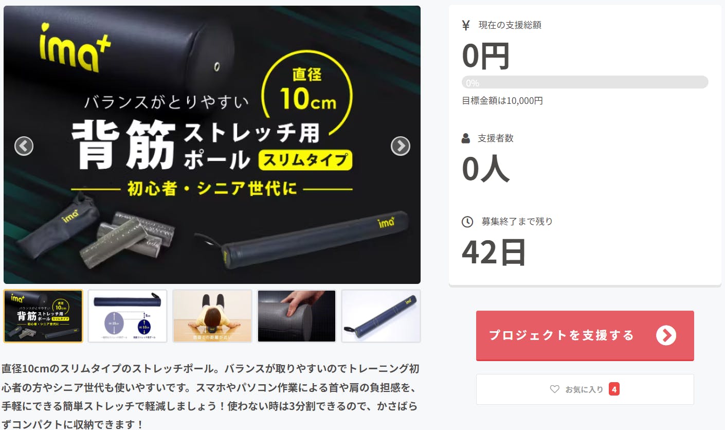 2024/01/18 16:00Campfireサポーターの皆様この度は「背筋ストレッチ用ポール」のプロジェクトをご覧頂き、ありがとうございます!現在、サポーター様は0人ですが、メンバー一同頑張っております!引き続き、皆様の応援よろしくお願い致します。aimedia_official もっと見る