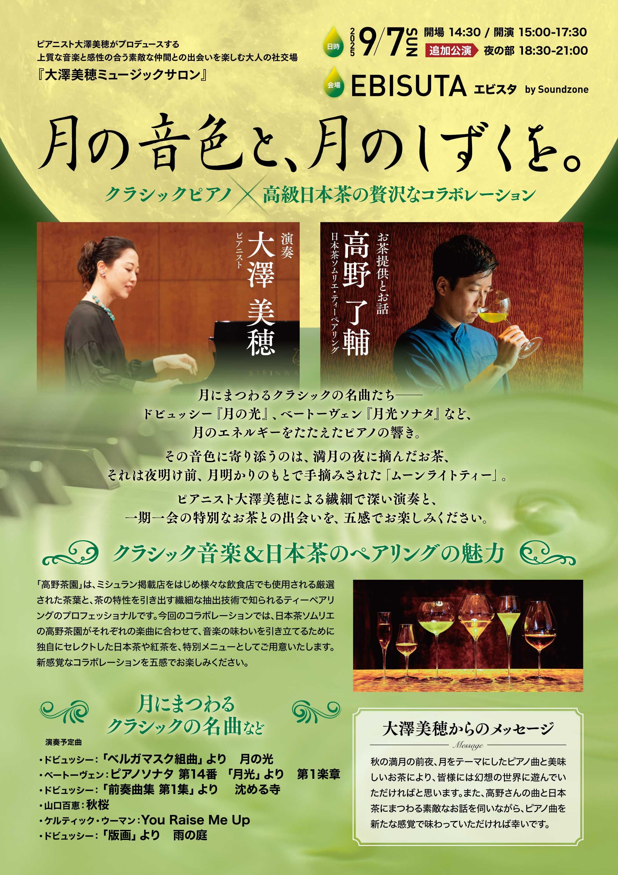 2025/08/01 19:51皆様、こんばんは。ご無沙汰しておりますが、お元気でお過ごしでしょうか。今日から8月に入りましたが、もう既に暑さが長引いている感じがしますね。まだこれから夏本番となりますので、熱中症など、くれぐれも気をつけてお過ごしくださいませ。さて、私の方は、今年はいろいろと新たなチャレンジをしておりまして、先日は初めての交流会付きコンサートが無事に終わりました。そのことをこちらに書きましたので、よろしければお読みくださいませ。その日の写真は、こちらに掲載しております♪来月は、日本茶ソムリエの高野了輔さんとご一緒に、恵比寿で交流会付きのコンサートを開催致します。9月7日は満月の前日なのですが、満月の夜に摘まれたお茶を召し上がっていただきながら、ドビュッシーの「月の光」やベートーヴェンの「月光」をお聴きいただく企画です(^^)高野さんは大変なクラシックファンでいらっしゃって、当日は日本茶とピアノ曲にちなんだお話なども、していただく予定です。こちら、ご好評につき残席が少なくなりましたので、追加公演として夜公演も行うことに致しました!【日時】9月7日(日)昼公演 15:00-17:30夜公演 18:30-21:00【会場】エビスタ【参加費】7,000円(お茶&お菓子付き)【お申込み】こちらから♪チラシの裏面です。前半はコンサート、後半は日本茶とお菓子とともに、参加者の皆様同士の交流タイムにさせていただきます。もちろん、私も皆様とお話出来ますのを楽しみにしております!当日は私の好きなドビュッシーの作品の他に、YouTube「Miho's casual piano」にアップしている曲などもお聴きいただきますので、ぜひお気軽に聴きにいらしてくださいませ。皆様のご来場を楽しみにお待ちしております! もっと見る