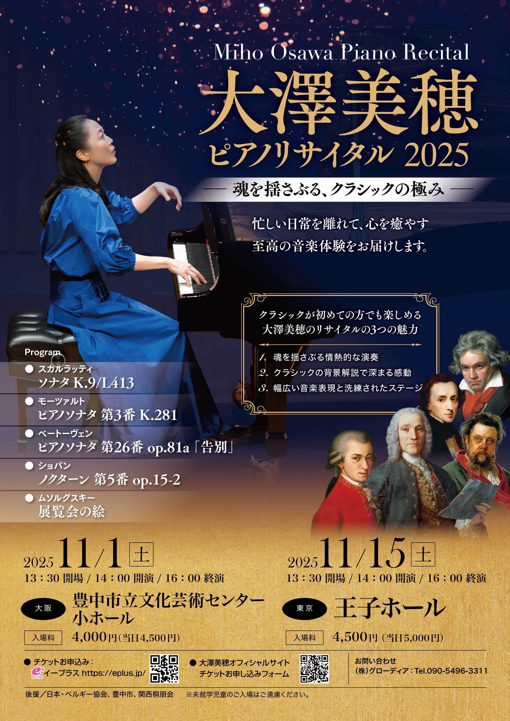 2025/09/25 15:32皆様、こんにちは!このところ、ようやく過ごしやすい気候になりましたが、お元気でお過ごしでしょうか?私の方は、今月初めに企画した日本茶ソムリエの方とのコラボコンサートが無事終わり、今は秋のリサイタル準備に励んでいるところです。コラボコンサートの模様は、こちらをご覧くださいませ♪この秋のリサイタルは、ザ・クラシック的なプログラムで(^^)、皆様にはクラシックの魅力を存分に味わっていただきたいと思っております!今回の前半は、しっとりと美しいスカルラッティ(イタリア・バロック音楽の巨匠)のソナタに始まり、モーツァルトやベートーヴェンの生気あふれるソナタを、後半は柔らかく繊細なショパンのノクターンと、19世紀ロシアの作曲家ムソルグスキーの大曲「展覧会の絵」をお楽しみいただきます。メインの「展覧会の絵」は、ムソルグスキーの生前は演奏されることがなく、作曲家は失意と生活苦の中でこの世を去りました。後にラヴェルがオーケストラ用に編曲したことにより、世界中に大人気の曲となりましたが、今回のリサイタルでは、オリジナルのピアノ曲ならではの魅力を最大限に表現し、作品の魂を皆様の心の奥底に届けられるよう、全身全霊で演奏したいと思っております!皆様お忙しいことと存じますが、ご都合がつきましたら是非聴きにいらしてくださいませ。皆様のご来場を楽しみにお待ちしております!!チケットのお申し込みはこちらから♪PS/YouTube「Miho's casual piano」も相変わらず続けております(*^^*) 今週は、秋ならではの懐かしい曲を弾いてみました♪https://youtu.be/mcnbqDRLG4E もっと見る