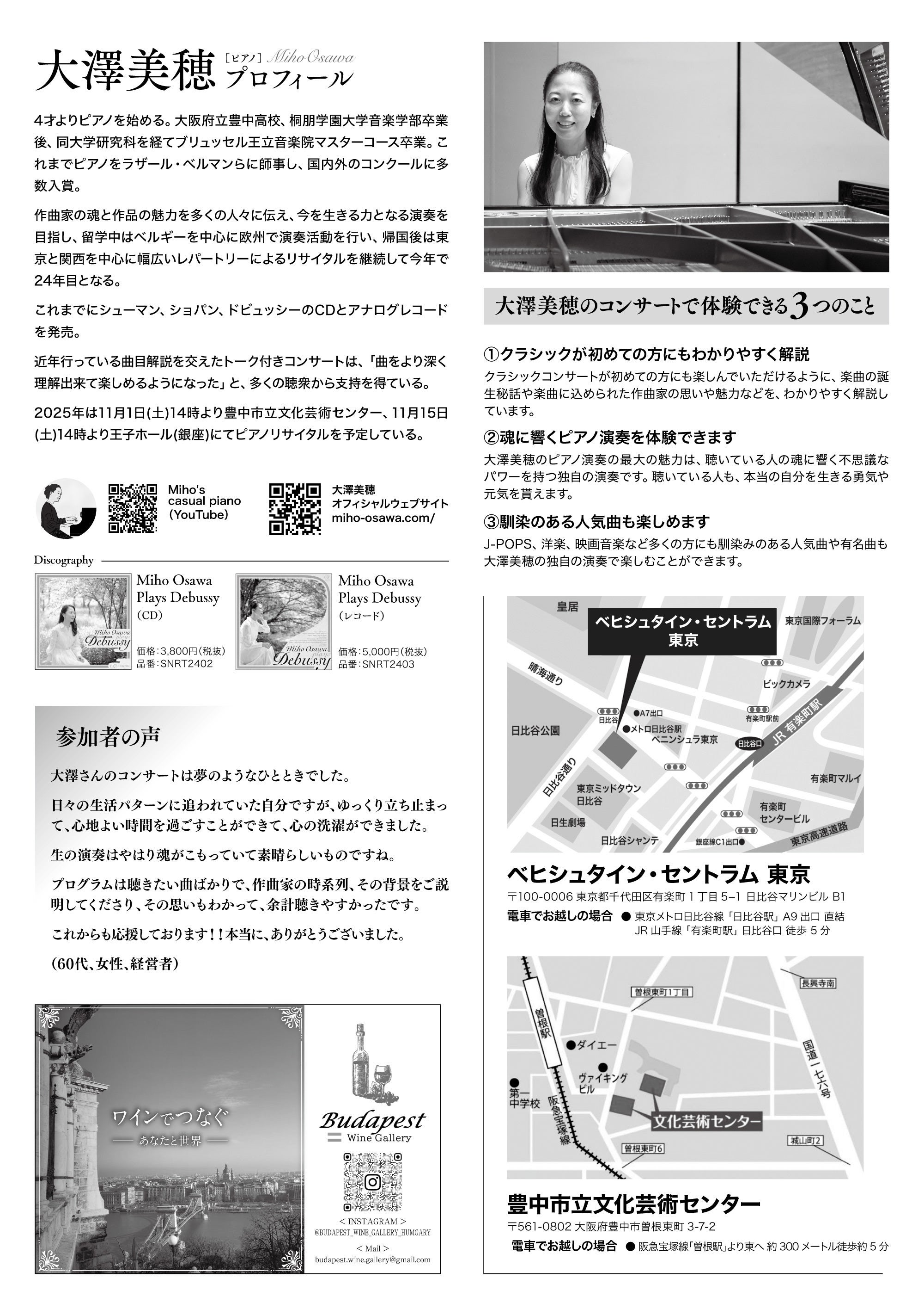 今回は初めて、クラッシックとポップス等が一度に聴けるコンサート、というのを企画してみました。当日は、クラシックもポップスも、曲の背景などのお話も挟みながら進行します。休憩時間には、ハンガリーワインもお楽しみいただきます。(最近試飲しましたが、美味しかったです(*^^*))