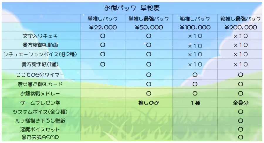 下記画像はお得パックの早見表です。