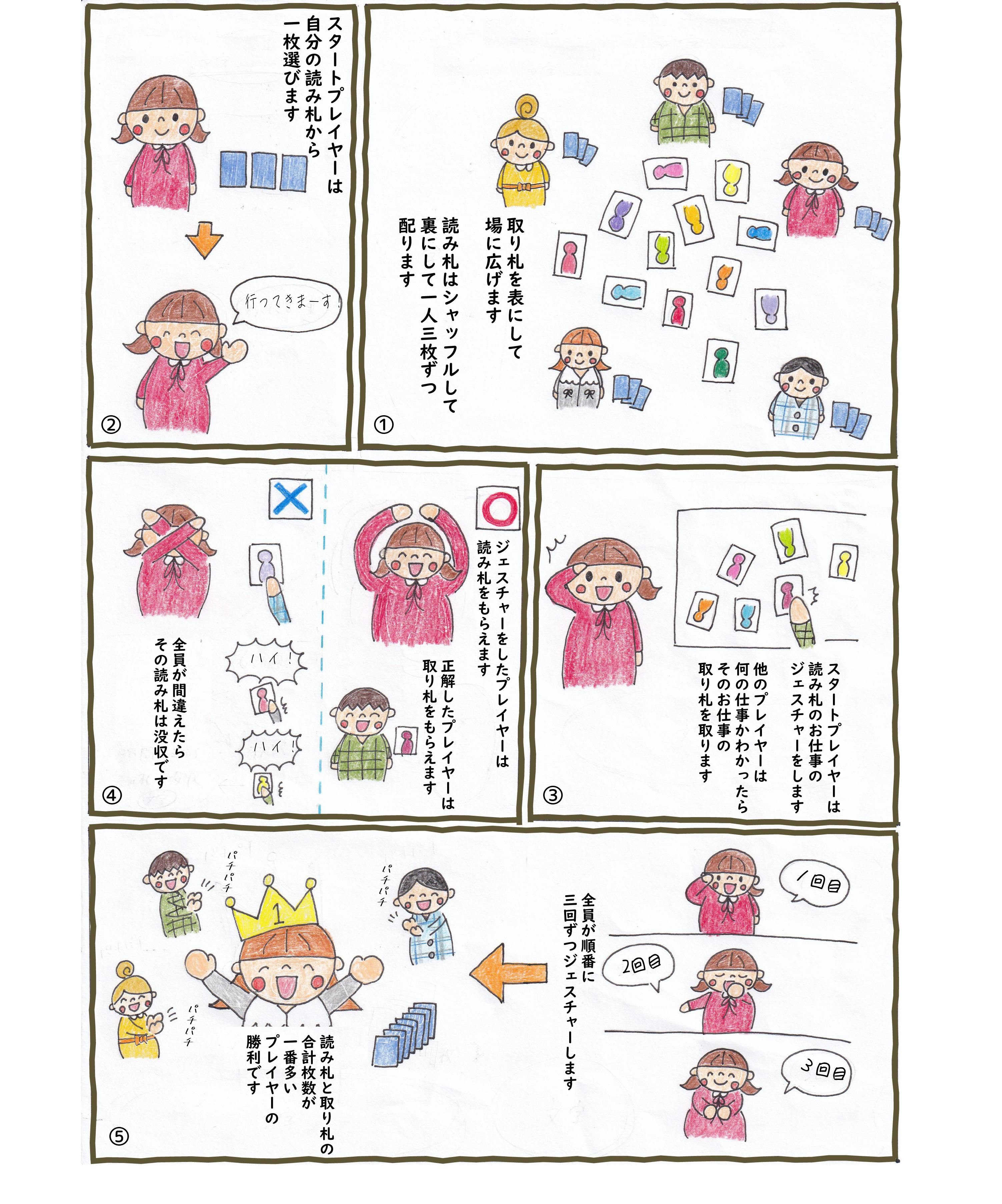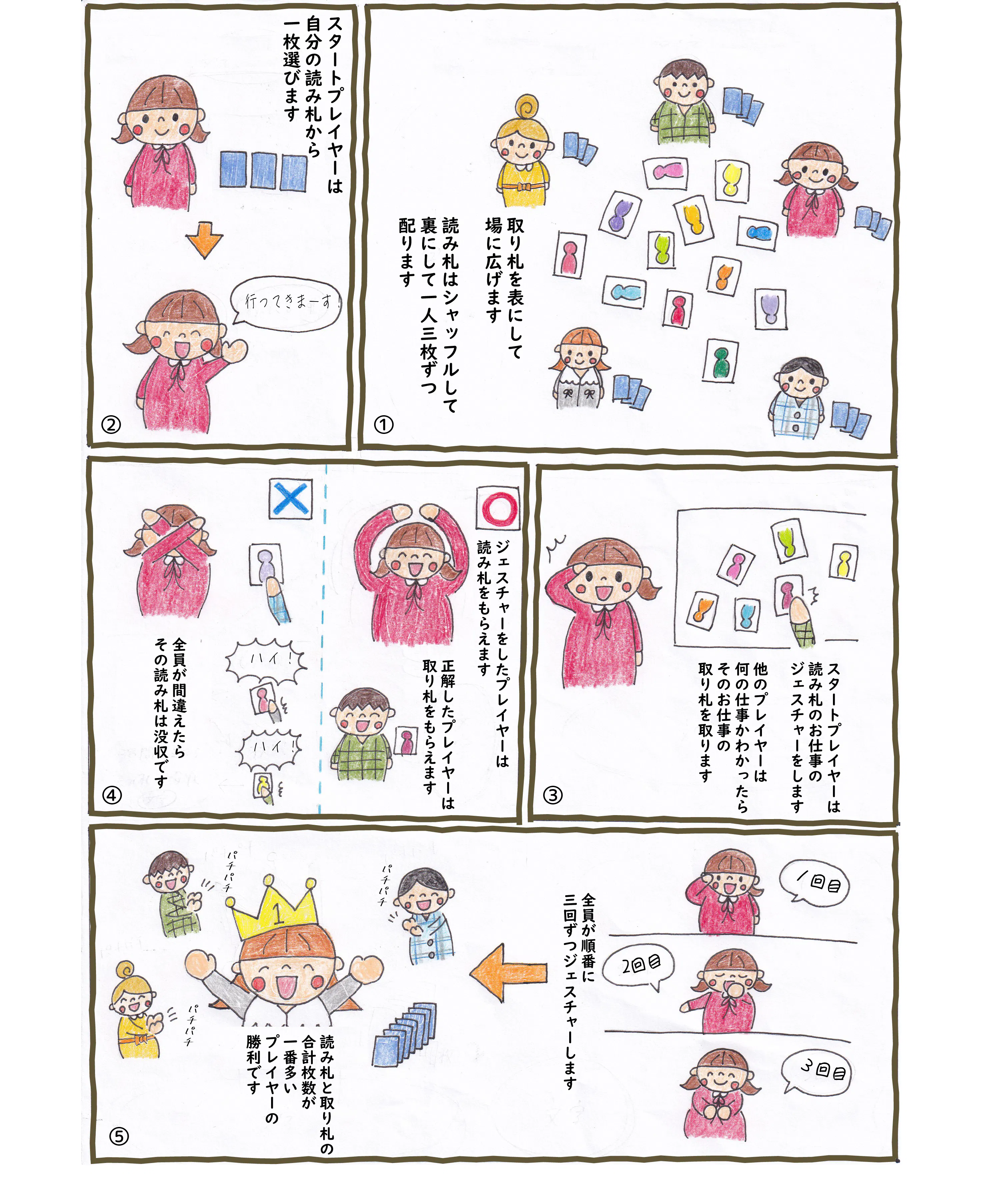 5. 全員が3回ずつジェスチャーしたら、読み札と取り札の合計枚数が一番多いプレイヤーの勝利です。
