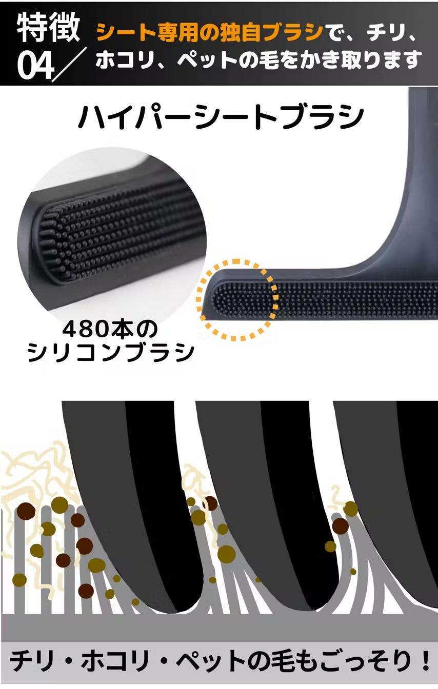 ブラシの先は柔らかく丸いので、シートやマットへのダメージはありません。