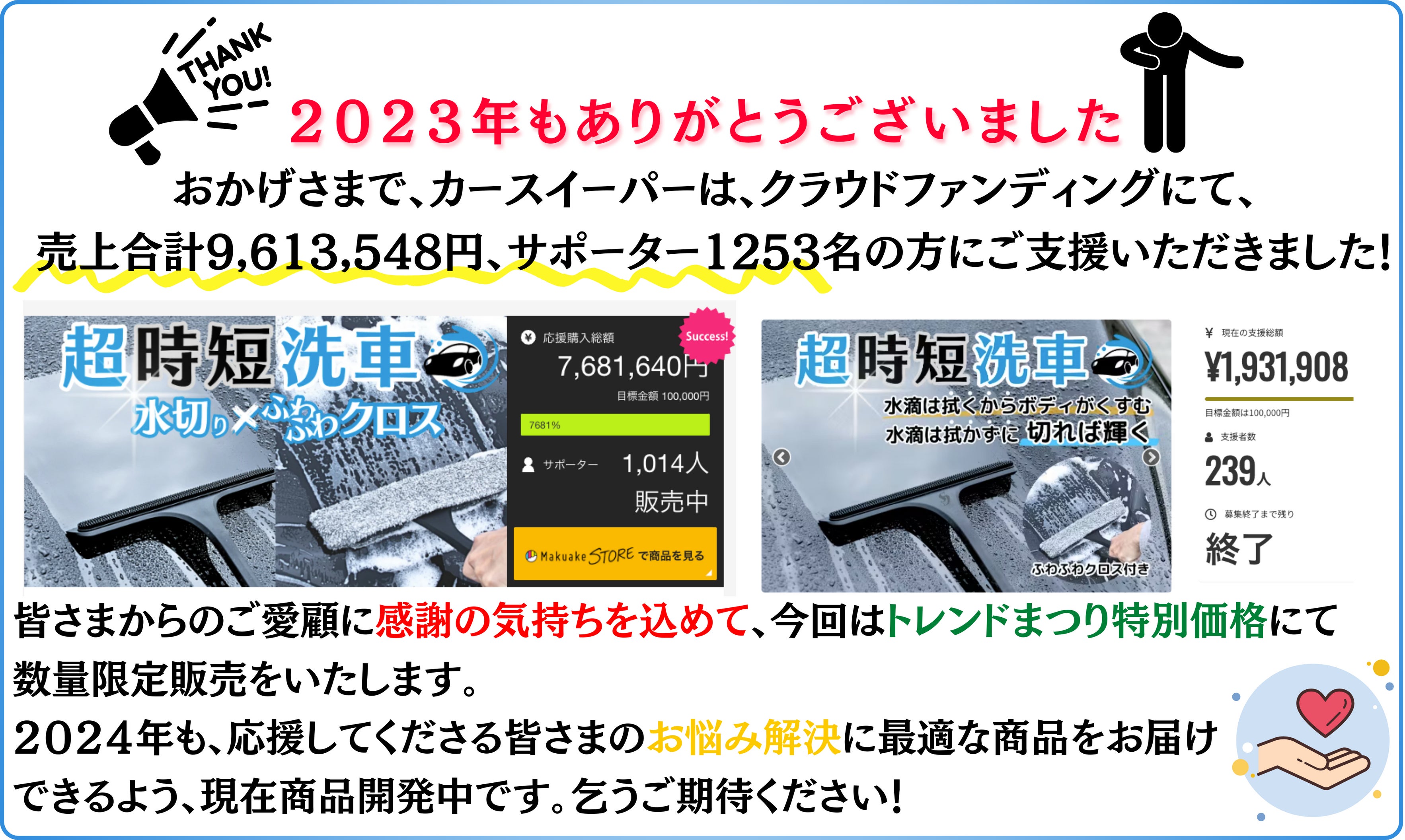 2025/01/09 20:16平素よりご愛顧いただき、誠にありがとうございます。 多くのご支援者の方々に「もっと手軽に購入したい!」というお声をいただいており、楽天市場にてファンタベース公式ショップをオープンいたしました!心より感謝申し上げます。感謝の気持ちを込めて、公式ショップオープン記念特別キャンペーン実施! CAMPFIREユーザー様限定で、以下のお得な3つの特典をご用意させていただきました1. 1000円OFFクーポン2. 楽天ポイント5倍3. レビューで漏れなくプレゼント特典は期間・数量限定となっておりますので、このチャンスをお見逃しなく! 取得はこちらから:https://coupon.rakuten.co.jp/getCoupon?getkey=Mk9OUi1BRlFYLTRLWkItV1JCQg--&rt=【期間】2025年1月9日 20:00 ~ 2025年1月16日 2:00皆様にさらに便利で楽しいわくわく体験をお届けします。株式会社ファンタベース スタッフ一同 もっと見る【本日11時公開】超時短洗車!NEW水切りカースイーパー