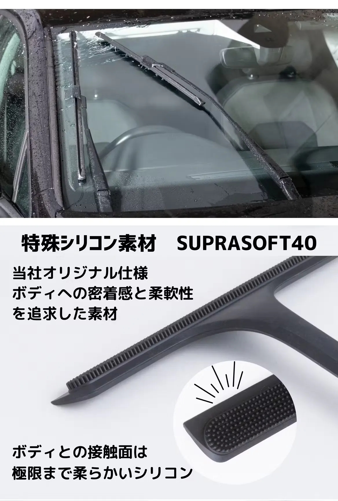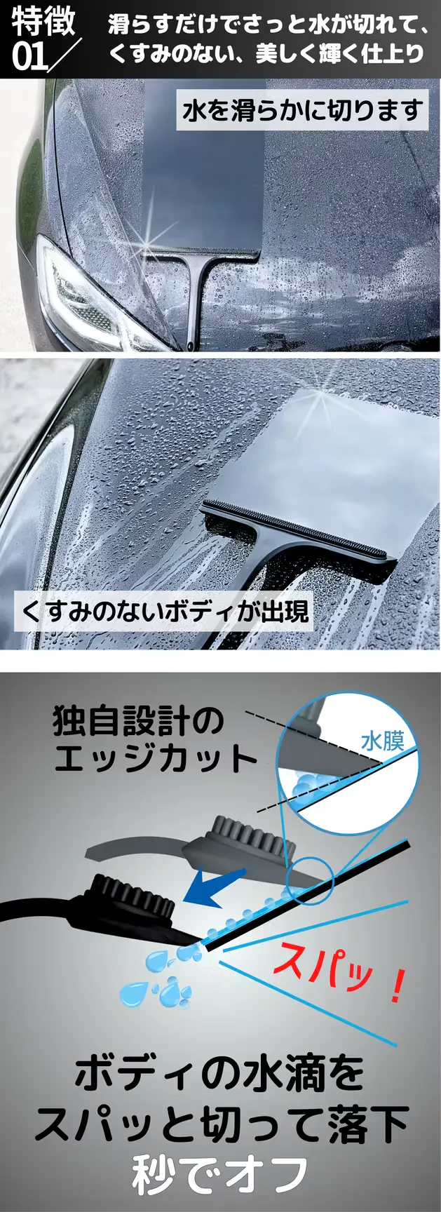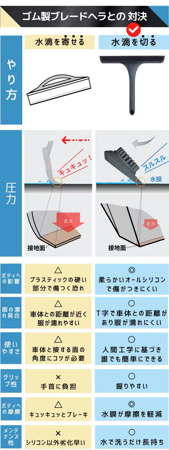 水が重力によって自然に流れるように、上から下に向かって、ワイパーを軽く滑らせて水を切ります。