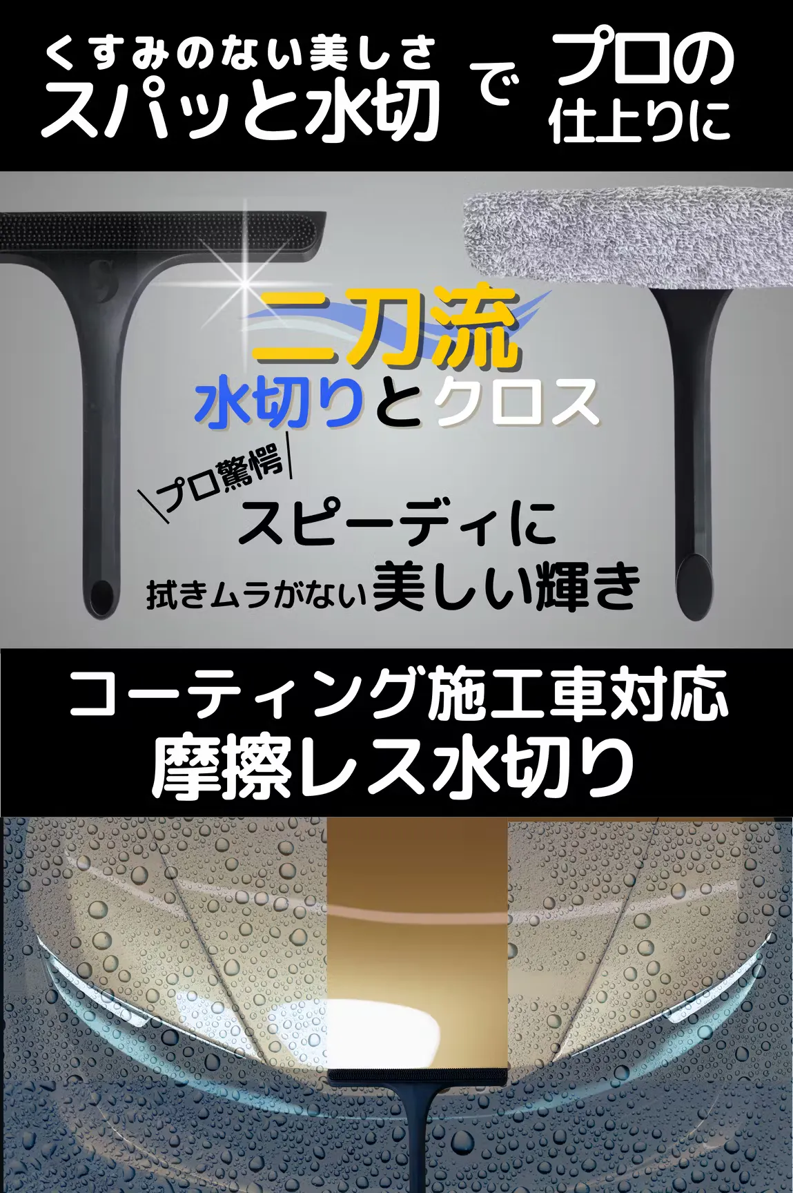 A4:利き手にカースイーパーを持ち、もう片方の手にクロスを持ちます。まずはカースイーパーで水を切っていき、ボディの隙間、段差によって取りきれない水滴を、すばやくクロスでさっと吸わせていきます。