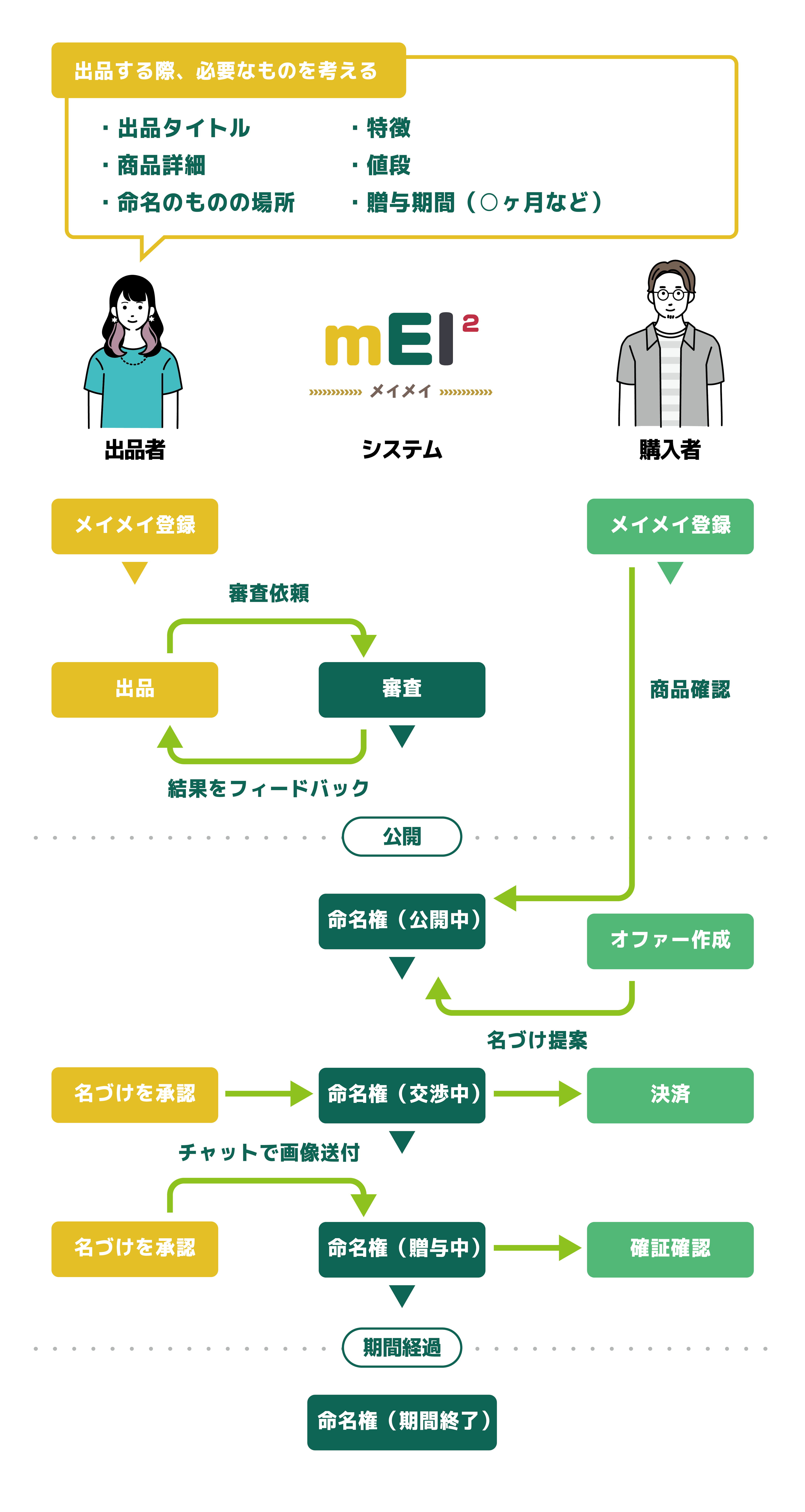 このようなトラブルを未然に防ぐための専門チームの存在が不可欠となりました。こうした背景を受けて『メイメイ』では、命名権をトラブルなく移管できるノウハウを詰め込み、取引の流れを仕組み化しました。