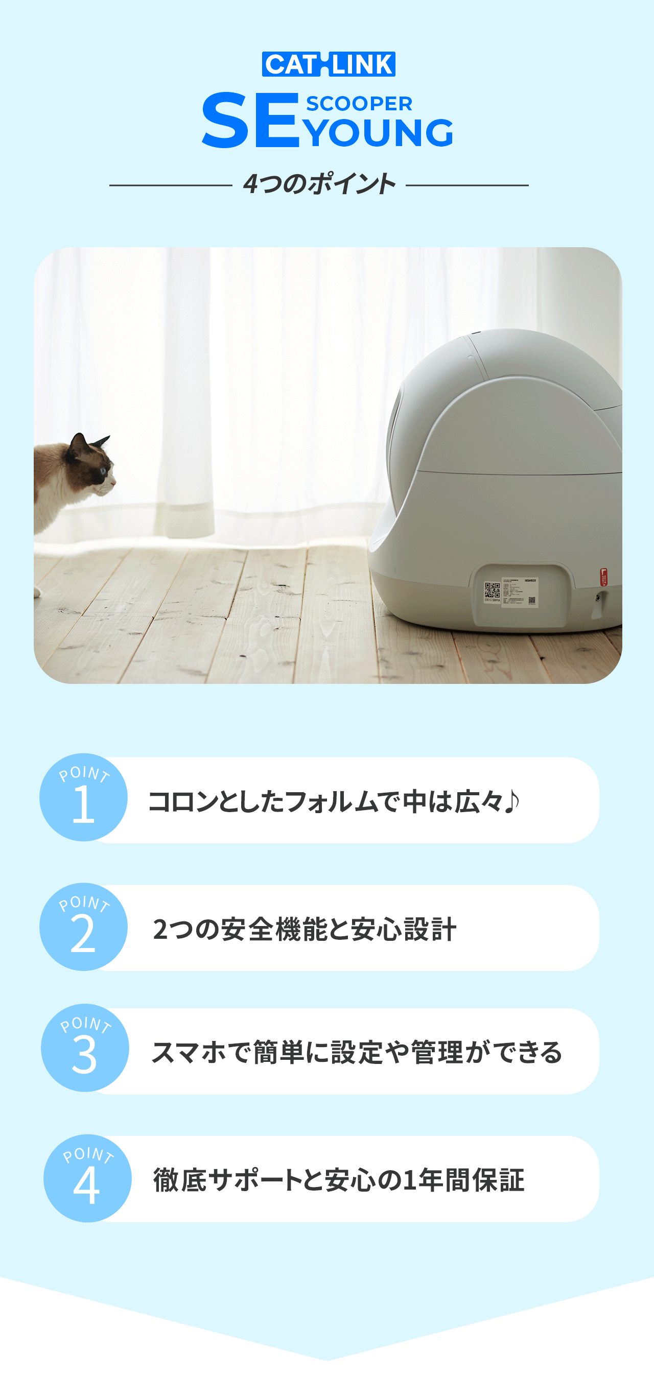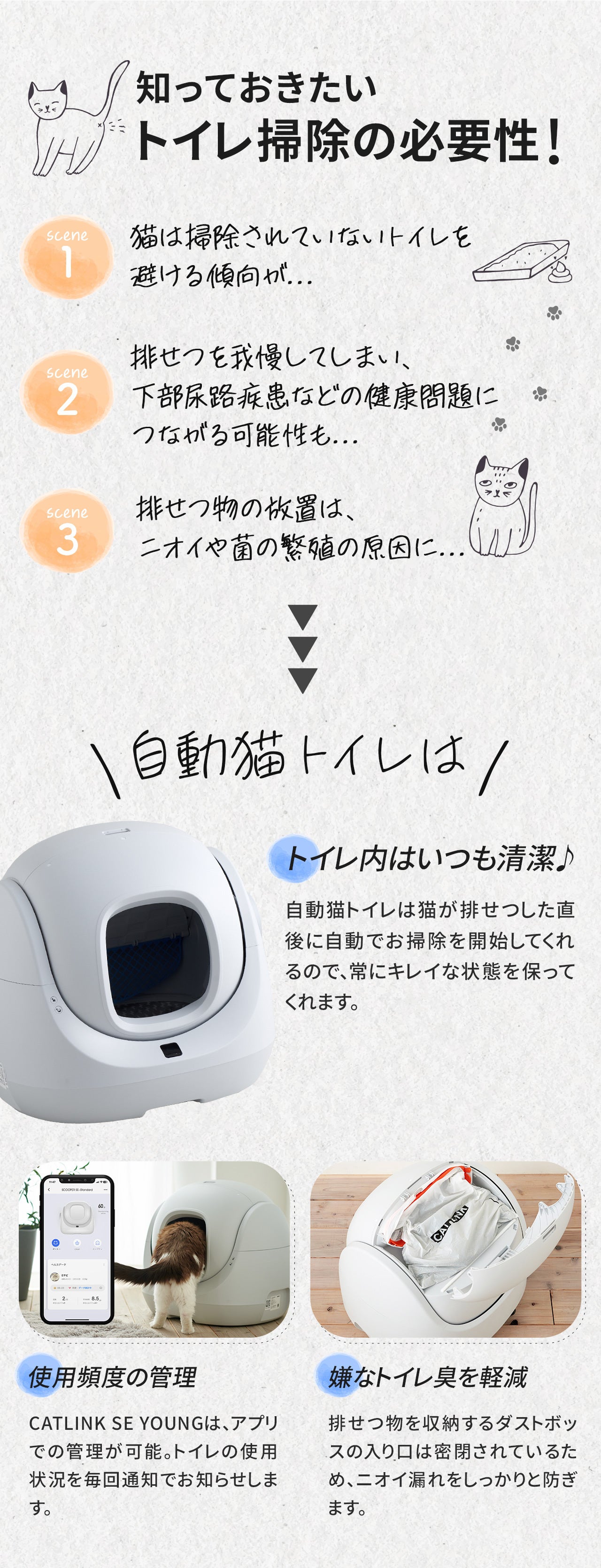 「CATLINK SCOOPER SE YOUNG」は、自動猫トイレのなかでもコンパクト設計!置き場所に困りません。スタイリッシュなフォルムに、トイレ内の空間も広々♪猫も飼い主さんも快適にご利用いただけます。
