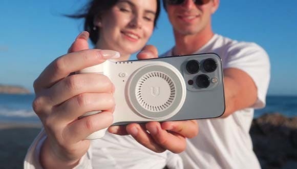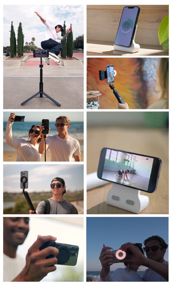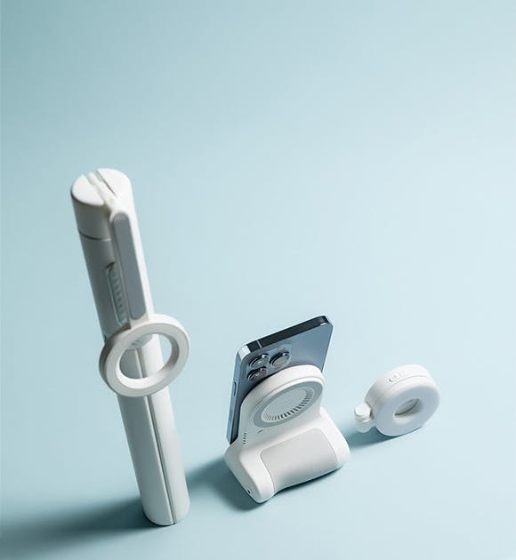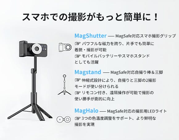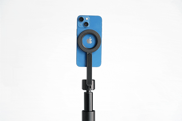 展開するとMagsafe対応のスマホ用三脚に変形することができ、ライブ配信や動画撮影、記念撮影、大人数での集合撮影などの場合、より広い角度で撮影することができます。
