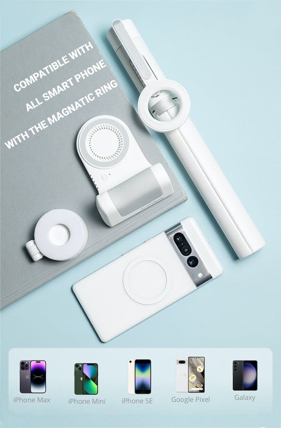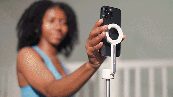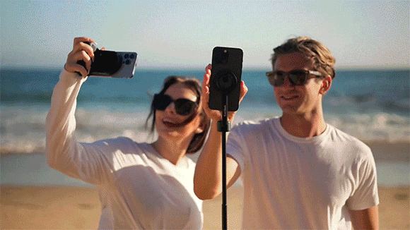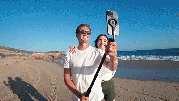 スマホをMagSafe対応の丸い台座で簡単固定するだけで、自撮り棒として使用できます。