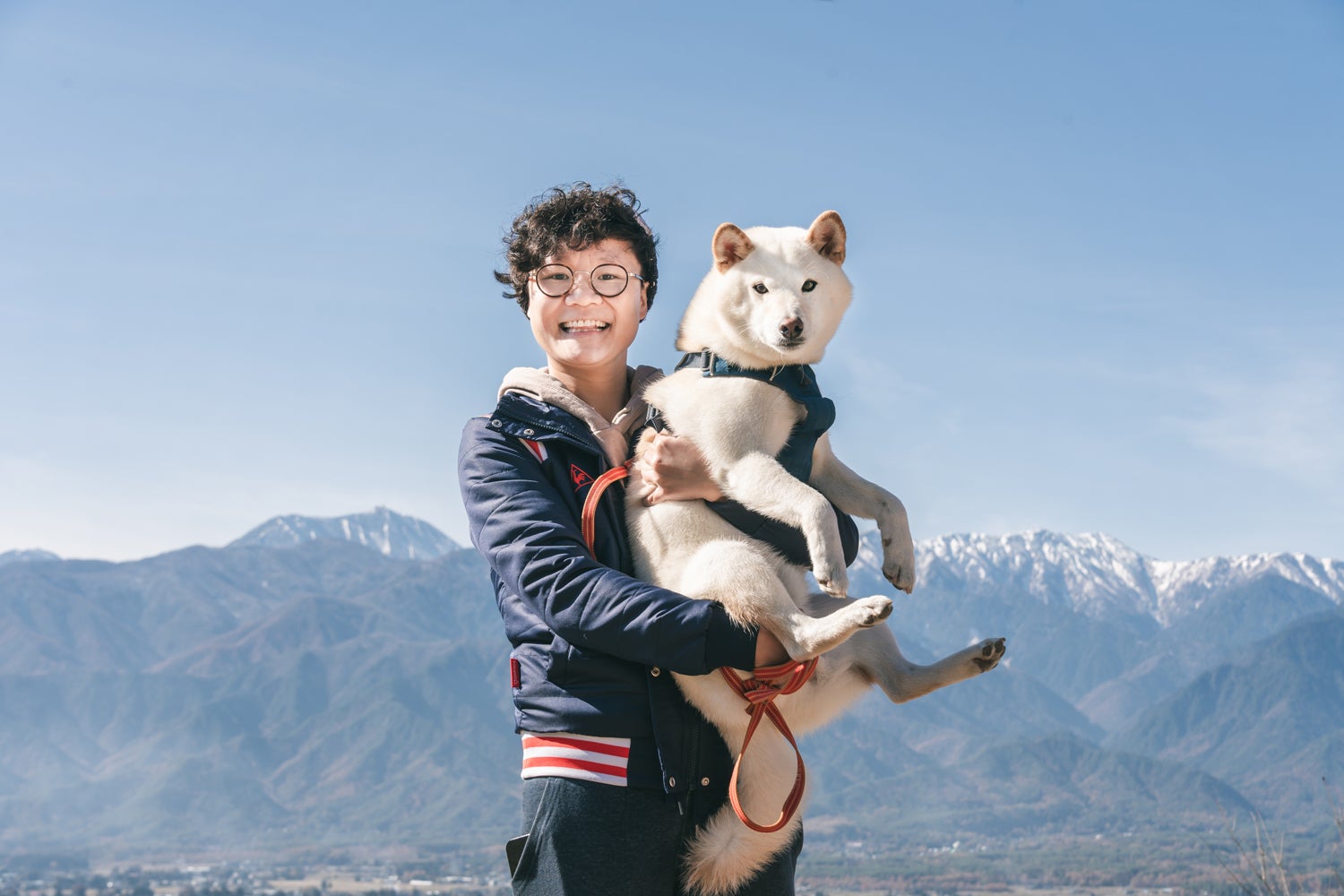 北アルプスを背景に愛犬のそらと