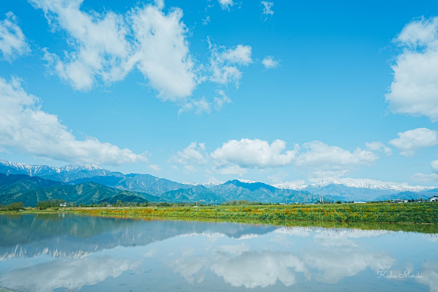 池田町の春は、北アルプスと水鏡が美しい