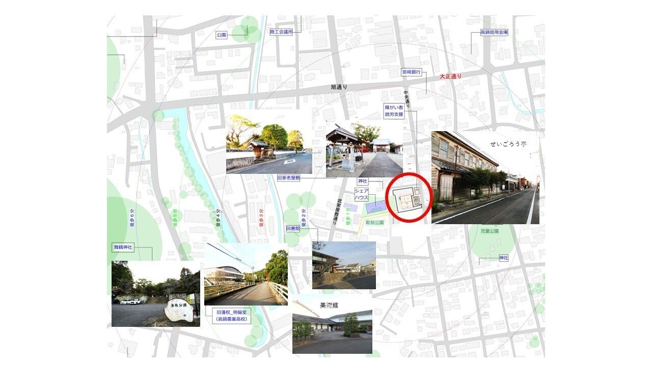 「友愛の森」の場所は、高鍋藩時代の家老屋敷通りと商店街にはさまれ神社にも隣接しています。図書館や美術館や城跡も散歩コース内です。藩校「明倫堂」に通う石井十次少年達が散策したことでしょう。明治期「せいごろう亭」のご主人は、石井十次の救済事業を支援したこともあります。