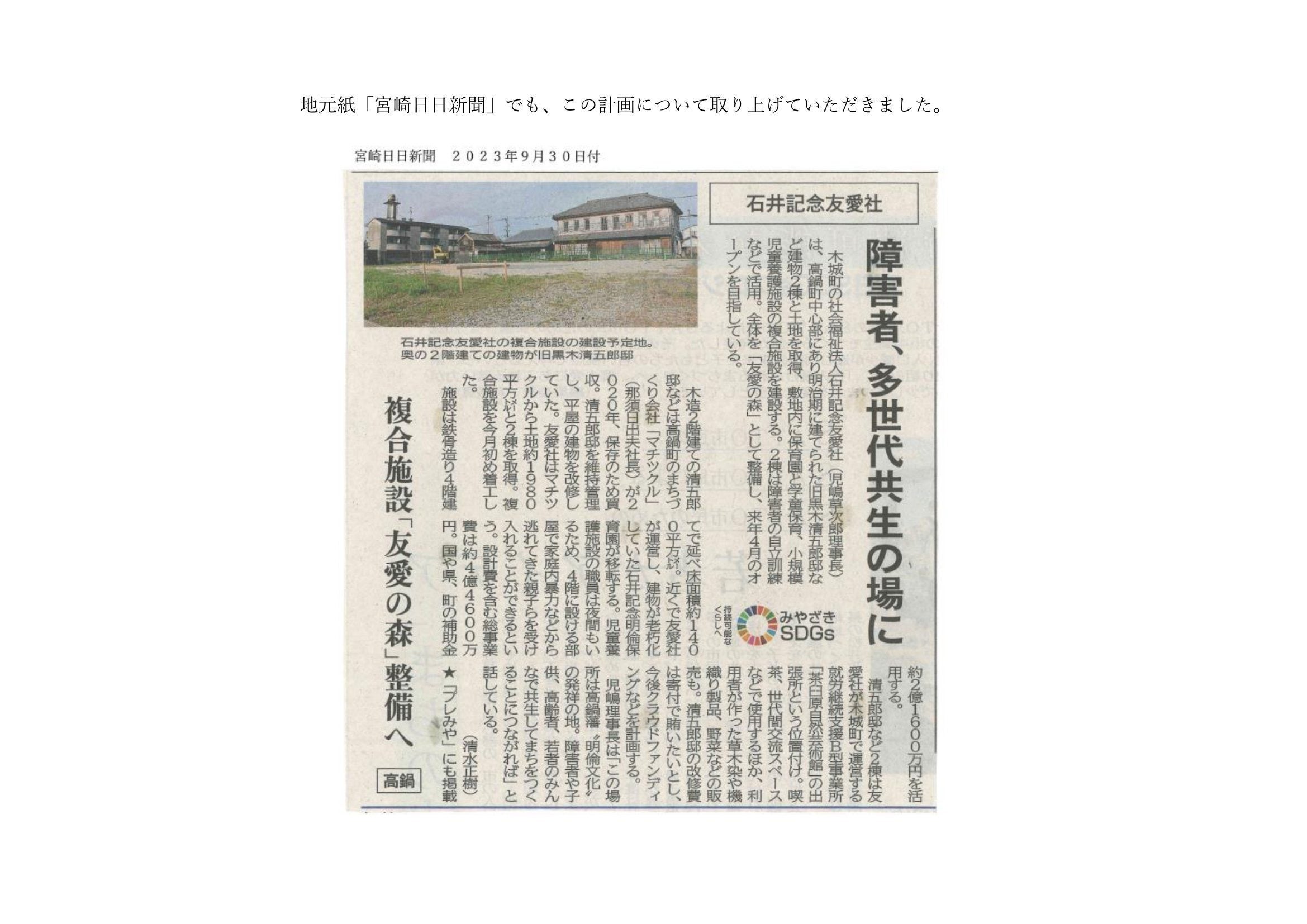 現在、宮崎県高鍋町に、障がい者施設、保育園、児童養護施設の複合施設を建設中です。