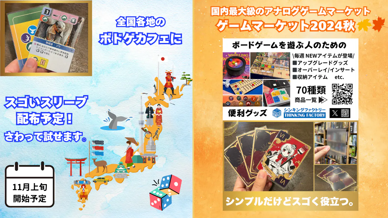 まずは、日本国内最大級のアナログゲームマーケットであるゲームマーケット2024秋 11月16日(土) 【ブース番号:L19】にて、サンプルの販売と試遊を実施予定ですので、ぜひお立ち寄りください!