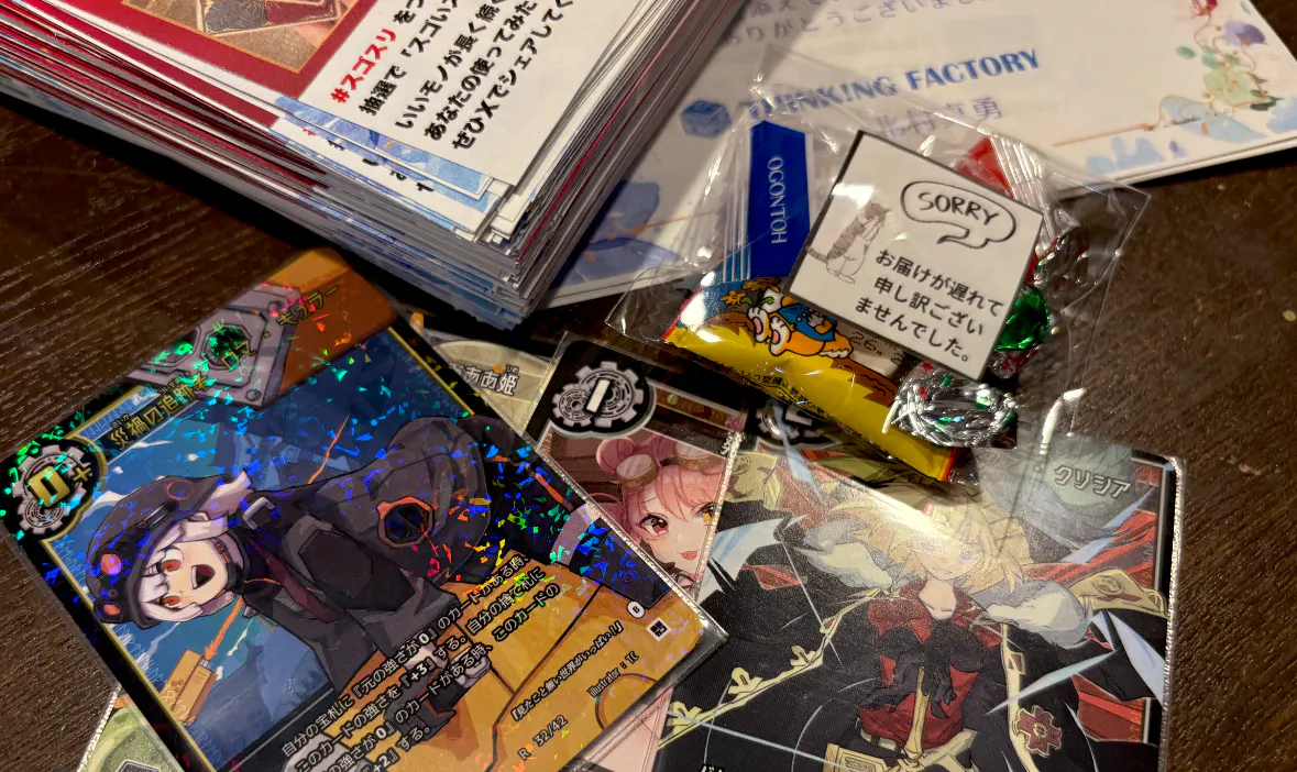 なお、今回のゲームマーケット用に事前に制作していたチラシには「スゴいスリーブ」の画像が掲載されておりますが、お約束通り、返礼品の発送が完了するまではイベントでの販売・展示は一切行いません。