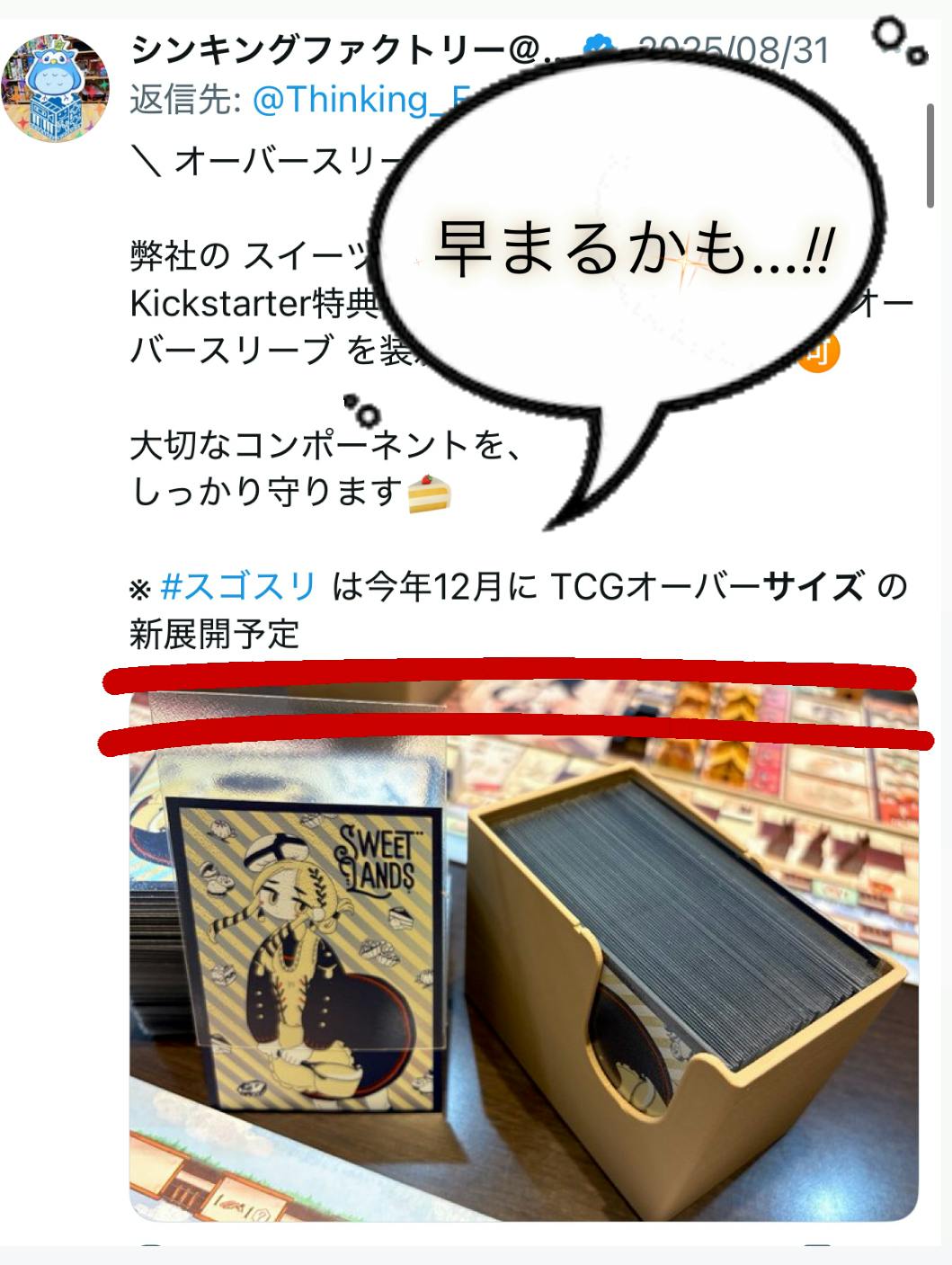 たとえば、TCGオーバーサイズの「スゴいスリーブ」は、ごく少量ですが 次回ゲムマ2025秋に持っていけるかもしれません!!