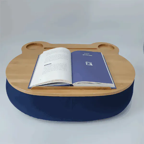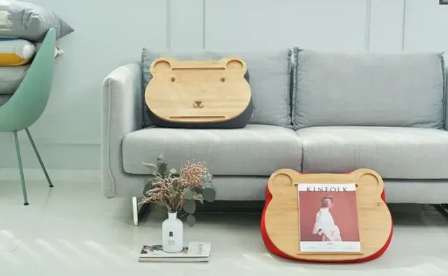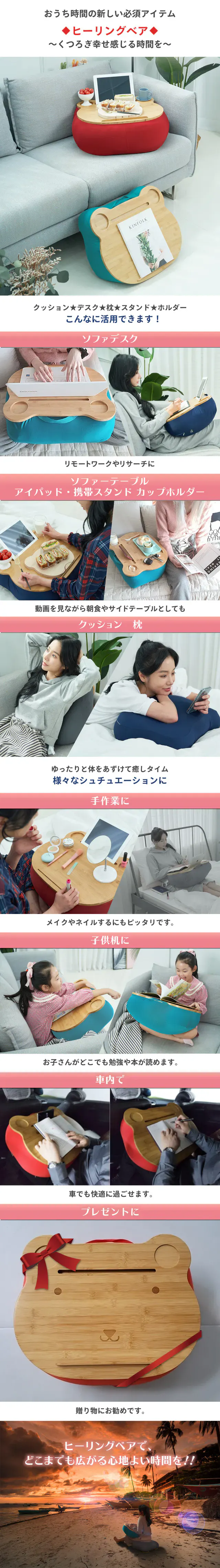 既存のクッションテーブルの高さは平均8~10㎝です。ヒーリングベアは20㎝。ノートパソコンテーブル、読書台として使用する際、安定感がある高さです。