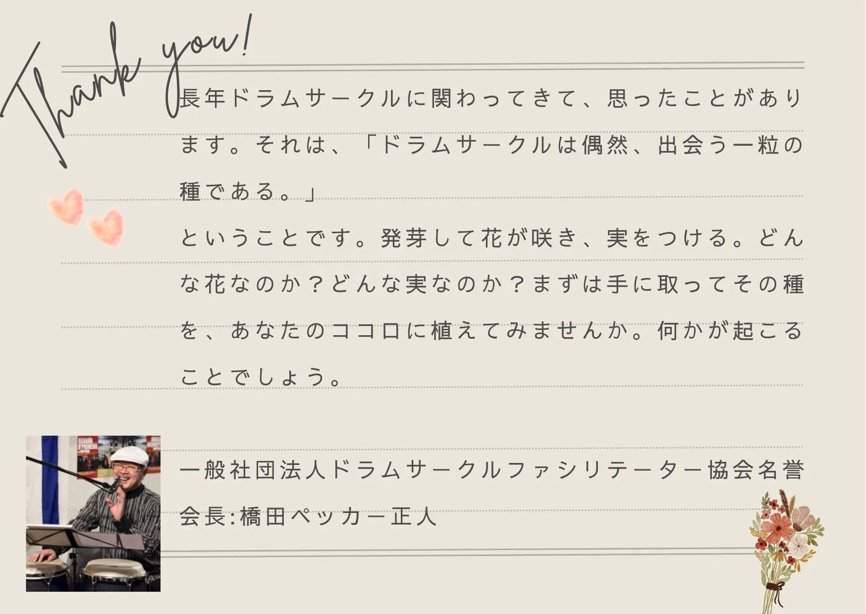 ドラムサークルの名誉会長 ペッカー様から応援メッセージいただきました!ありがとうございます‼