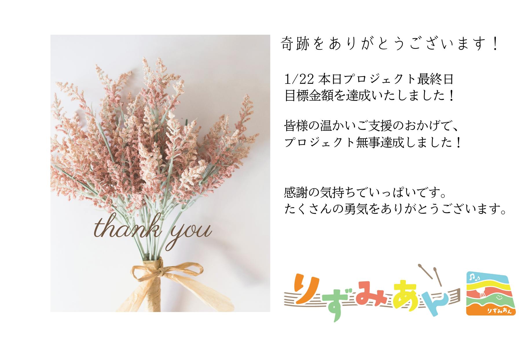 奇跡をありがとうございます!目標金額 達成しました!