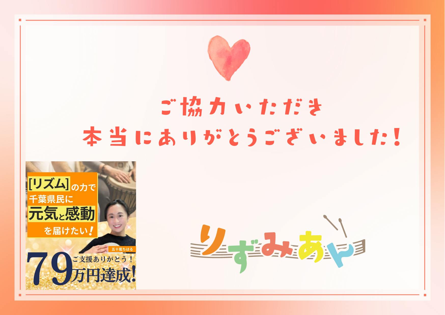 2024/01/23 20:26昨日、りずみあんのクラウドファンディングが無事終了いたしました。初めてのクラウドファンディングで、ギリギリまで達成できるかとても不安でいっぱいでしたが、皆様からのご支援や応援メッセージが力となり、目標金額を達成することができました。ご支援くださった皆様、プロジェクトのシェアや拡散、イベントに参加してくださった皆様、沢山の応援をしてくださった皆様へ、りずみあんメンバー一同心より感謝申し上げます。本当にありがとうございました!そして、ここからがりずみあんのスタートです。ドラムサークルの音楽ワークショップで人と人の繋がりを深め、コミュニティを活性化したい。音楽の力で、地域社会の希薄化を少しでも解決できたらと願っています。人とのつながりを大切にしながら、地域活性化のために活動を展開し、このプロジェクトを応援してくださった方々へ恩返しができるよう精一杯取り組んで参ります。今後ともりずみあんをどうぞよろしくお願いいたします。・・・・・・ご支援くださった皆様へ本日、お礼のメッセージを送信しましたが届いておりますでしょうか?もし届いていないようでしたら、ご一報ください。リターンの配送がないご支援者様につきましては、クラウドファンディングのシステム都合上、メールアドレス・アカウント名とご支援金以上の情報を把握することができない状況となっております。大変恐縮なのですが、お一人お一人にお礼を申し上げたく、お名前を頂戴できますでしょうか。お名前をご開示いただけない方には不躾ではございますがアカウント名をお名前としてご連絡させていただければと存じます。余計なお手数をおかけして誠に恐縮ですが、何卒よろしくお願い申し上げます。 もっと見る