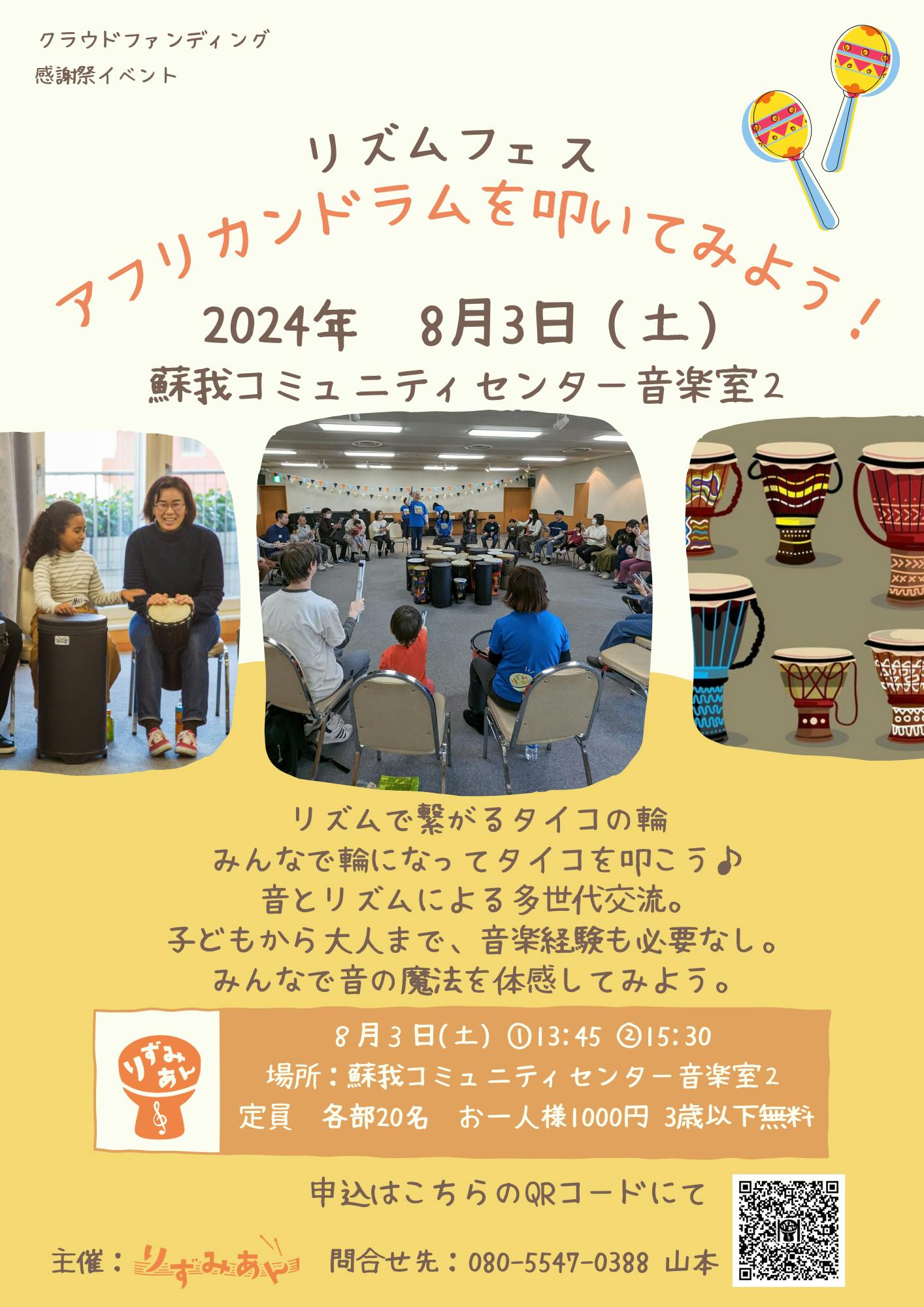 2024/06/26 18:18梅雨に入ってから湿度の高い陽気が続いていますが、いかがお過ごしですか?この度、皆様の温かい応援やご支援のおかげで、夏真っ盛りの8月に「クラウドファンディング感謝祭イベント」を開催する運びとなりました!みんなで一緒にタイコを叩きながら、楽しいひとときを過ごしましょう。楽しみにお待ちしております。開催日時日程: 8月3日(土)時間:① 13:45 -② 15:30 -(各回 定員20名程 先着順)会場場所: 蘇我コミュニティセンター 音楽室2住所: 〒260-0834 千葉県千葉市中央区今井1丁目14-43アクセス: JR内房線・外房線、京葉線「蘇我」駅西口より徒歩5分地図: 蘇我コミュニティセンター https://sogacc.jp/community/access/参加費大人: ¥10003歳以下: 無料申込方法申込フォーム: こちらからお申し込みくださいhttps://docs.google.com/forms/d/e/1FAIpQLSepwv6bIinJBC_dRNDFiLxPUh22lKxvMjivdezPvsJ8kYM5Qw/viewformぜひお友達やご家族とお誘い合わせの上、ご参加ください。りずみあん一同、皆様とお会いできるのを心より楽しみにしております! もっと見る