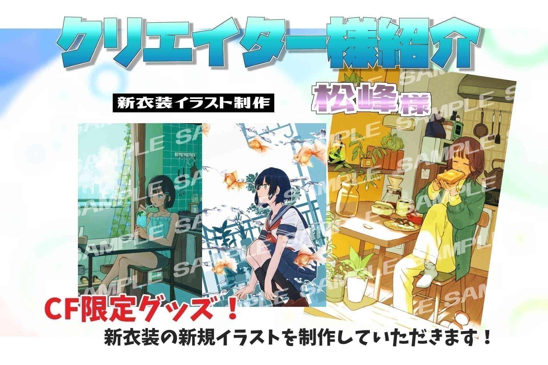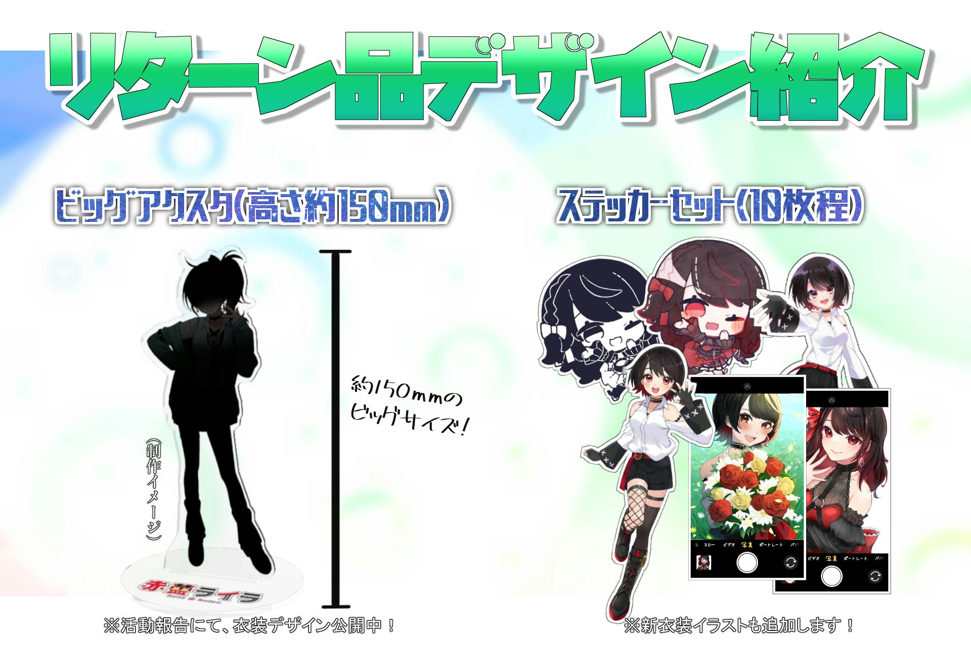 新衣装のキービジュアルや、今までのグッズイラストを使用したステッカーを数枚お届けします!