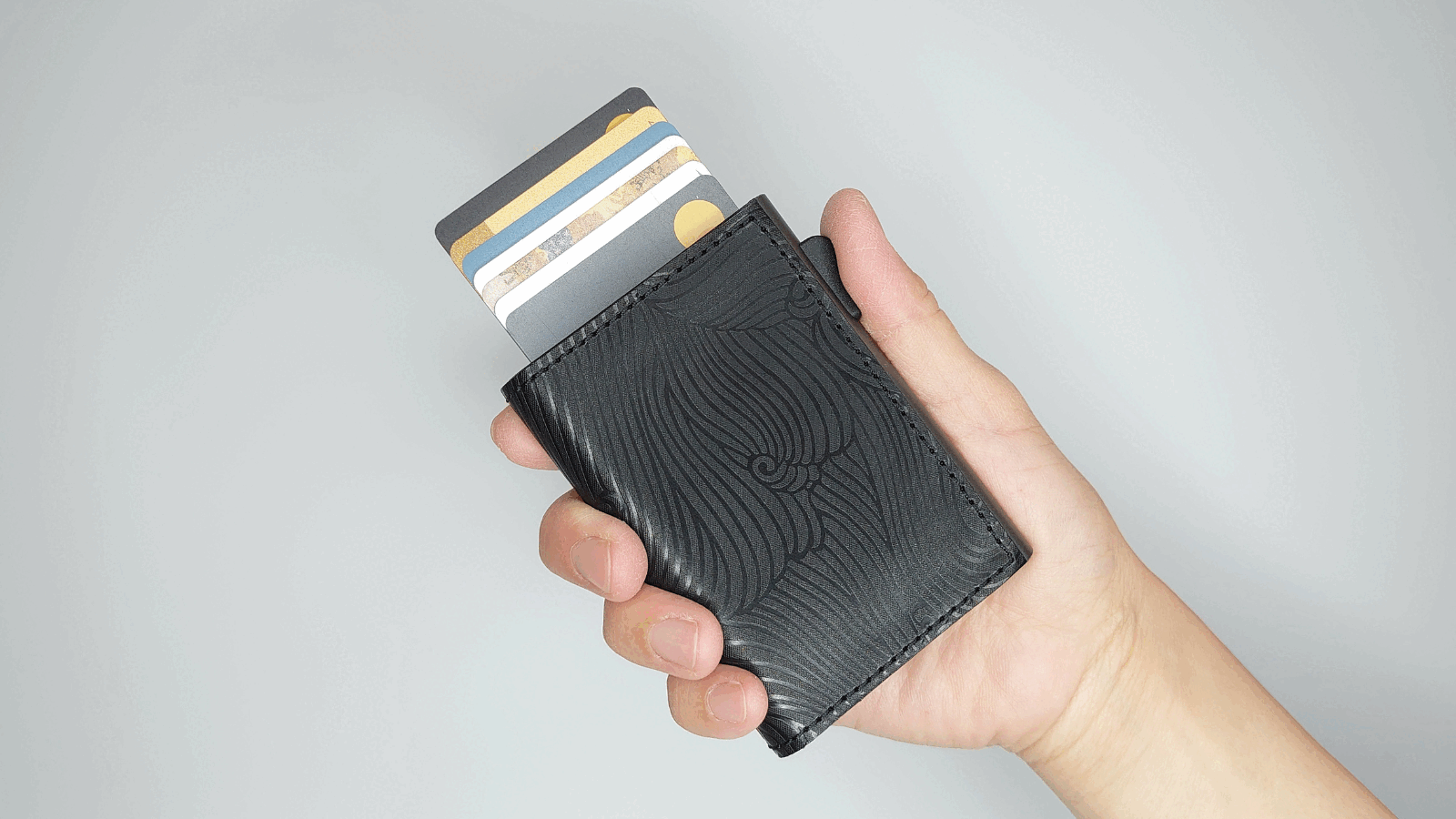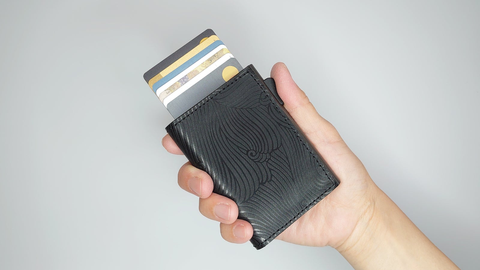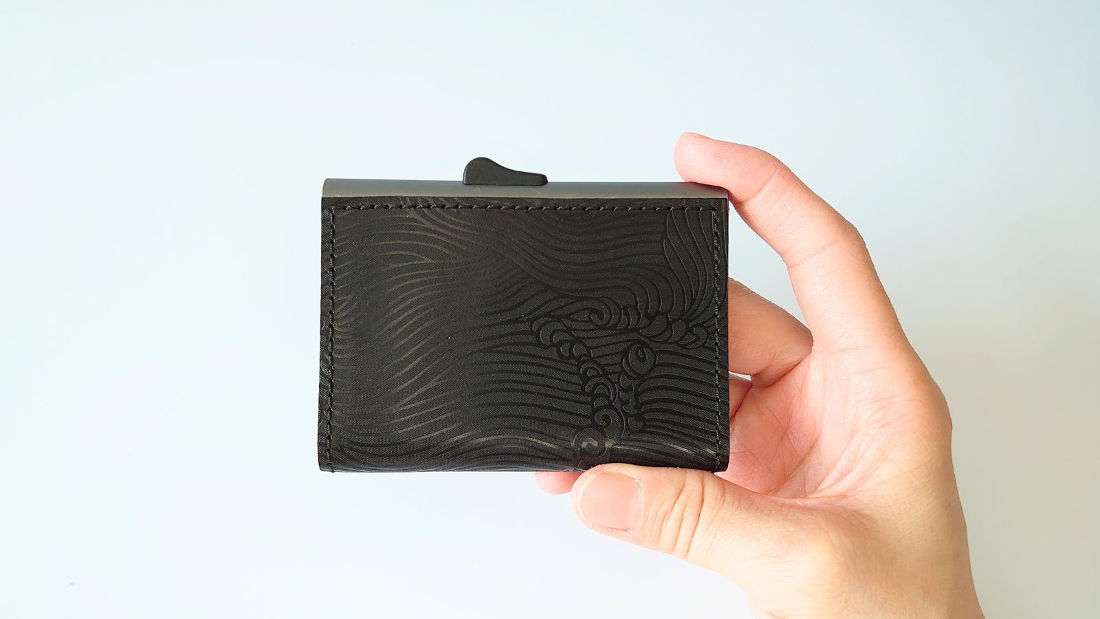 8~12枚のカードを収納しながらも、カードを重ねて収納するから、厚さは驚異の薄さ17㎜を実現しました。
