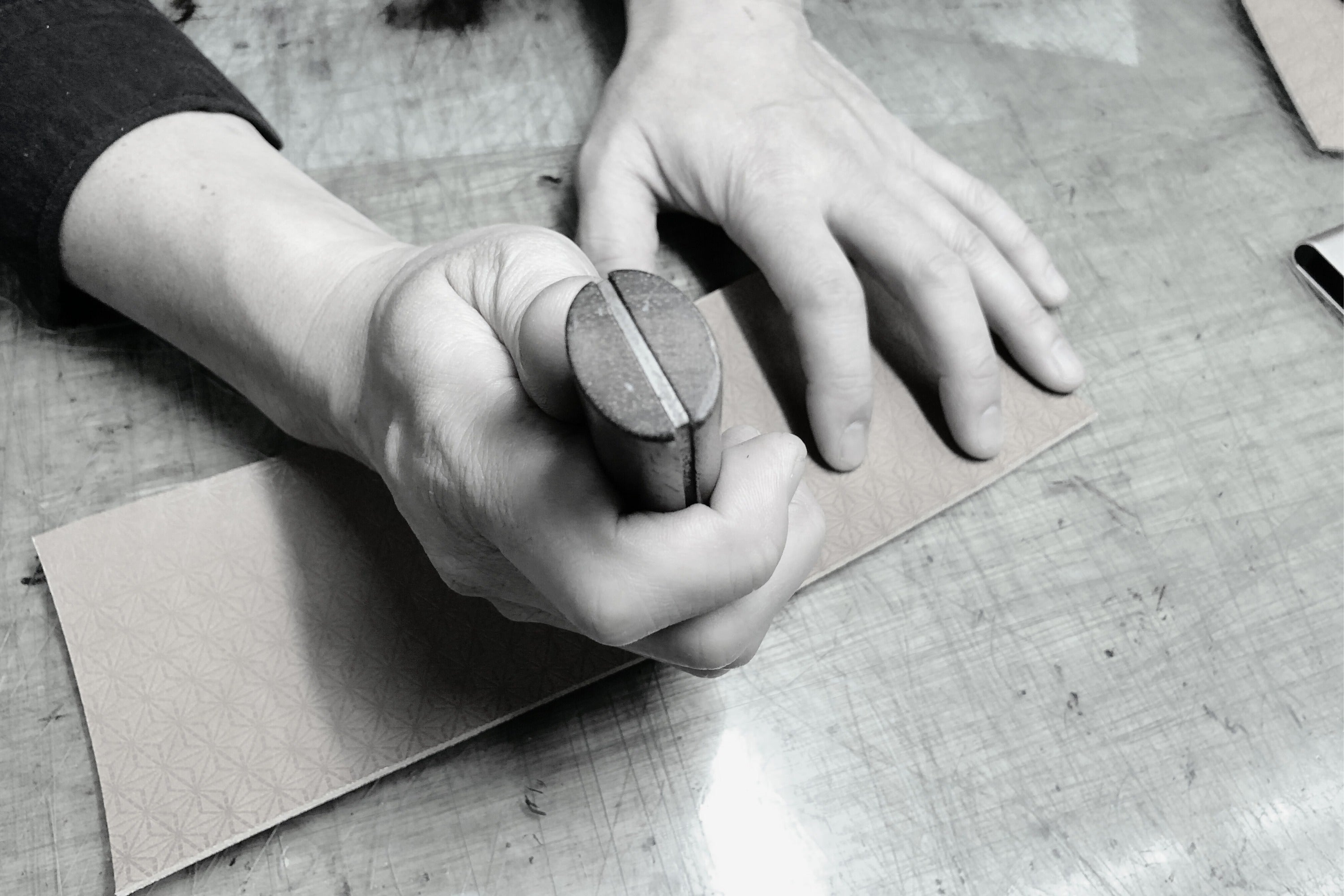 型捺染の中でも特に高度な技法が必要とされる「江戸小紋」を、機械ローラー捺染により手捺染のように染めることに成功した服部染工株式会社(創業大正十二年)が創意工夫、技術開発によって、革製品への型押し加工へ応用したものが『京友禅革』です。