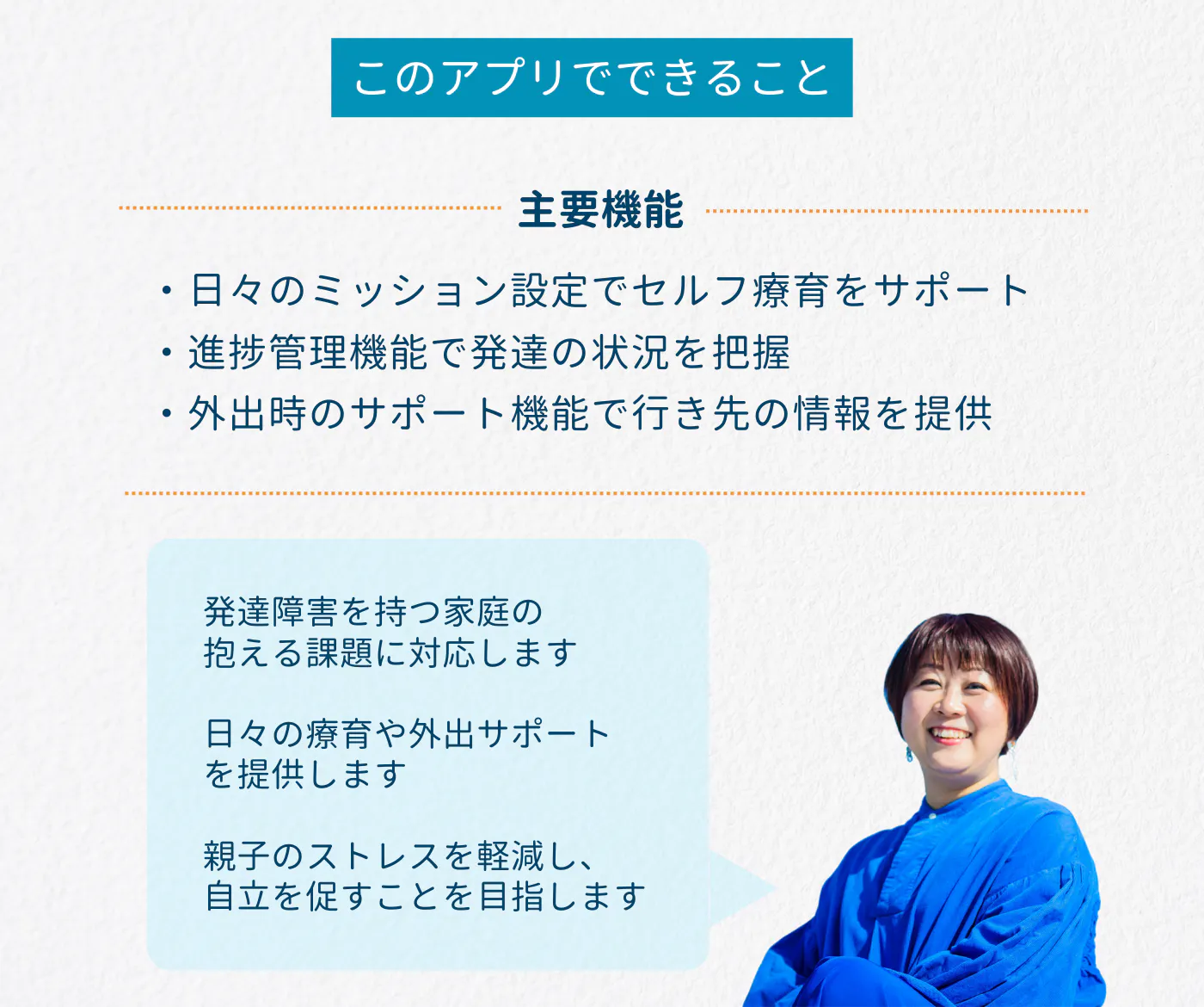 ミッションベースのタスクを通じて、子どもの発達をサポートし、保護者が家庭内で療育を実践できるツールを提供。