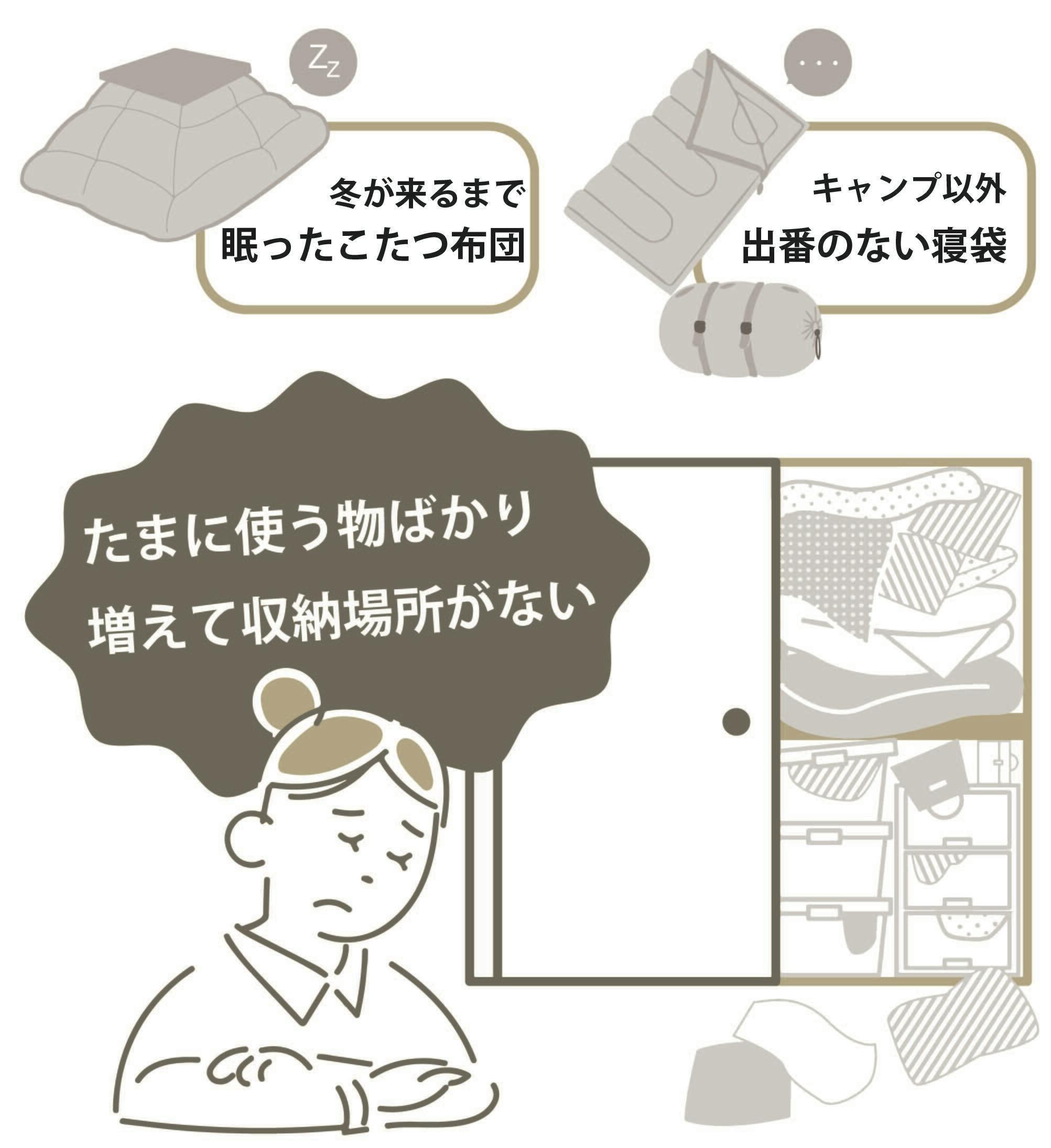 たまにしか使わない寝袋…、冬まで収納されたこたつ布団…