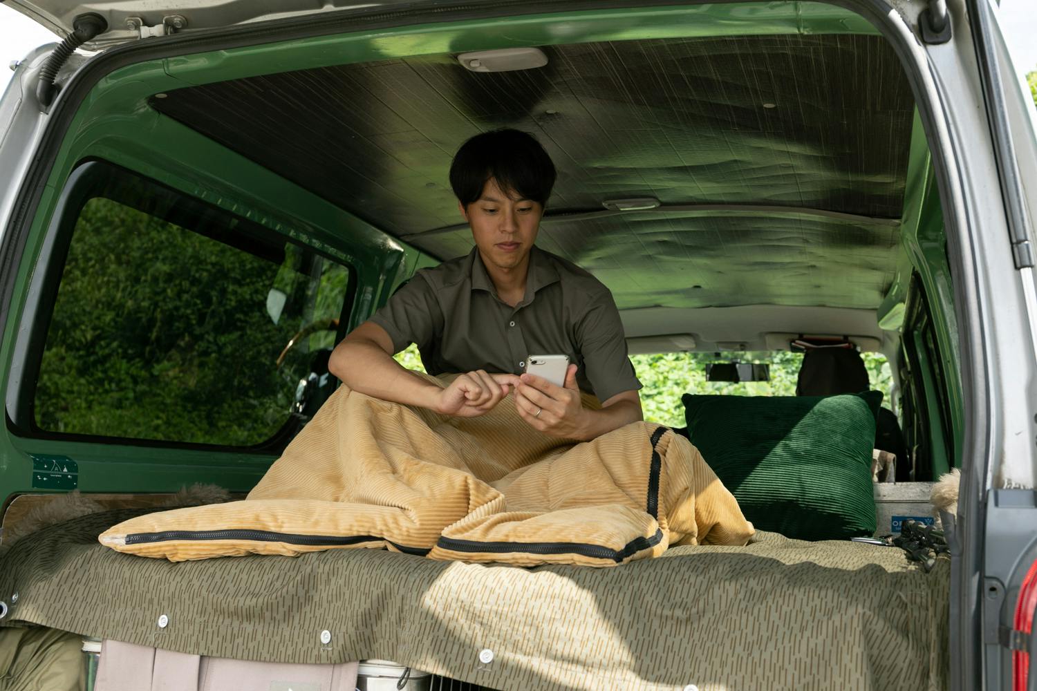 クッションの中身を出すとシュラフ(寝袋)に早変わり。キャンプや車中泊はもちろんのこと、お昼寝用の毛布やブランケットとして室内使いにもオススメです。